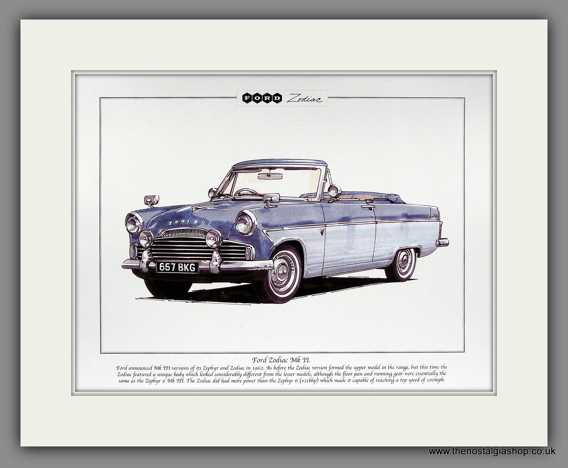 Ford Zodiac Mk2. Beautifully Illustrated print with detailed description of the vehicle. Presented and Supplied in a cream bevel cut mount with backing board and clear bag. The perfect gift. Size of the mount is 14 x 11 inches, it is ready to drop straight in to a frame. Framing option available on this print, Add this print to your shopping basket, then go to 'Frames Available" category, Click to buy the suitable frame. We will frame and post your choice. Free UK postage on orders over £20.00. Website watermarks are not present on the prints. Ford Prints, Ford Art, Classic Fords, Fast Fords, Ford pictures. Ford Clubs,