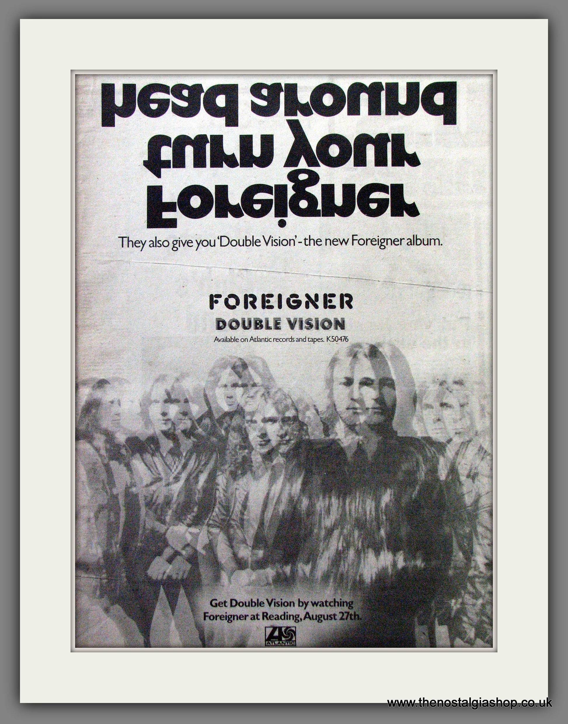 Foreigner Double Vision. Original Advert 1978 (ref AD13032). Presented and supplied in a cream bevel cut mount with backing card and clear bag. Ready to fit in a 20x16 inch frame. The mounted advert will be posted via courier and well packed - protected with a sheet of hardboard to keep it rigid. Any questions or enquiries, please get in touch, we are here to help! All our adverts, unless clearly stated are originals from the date shown. They make excellent pieces of wall art and stunning gifts. Many are rare and hard to find and once sold, may not be replaced. Remember you are buying a piece of history. Website watermark is not on original.