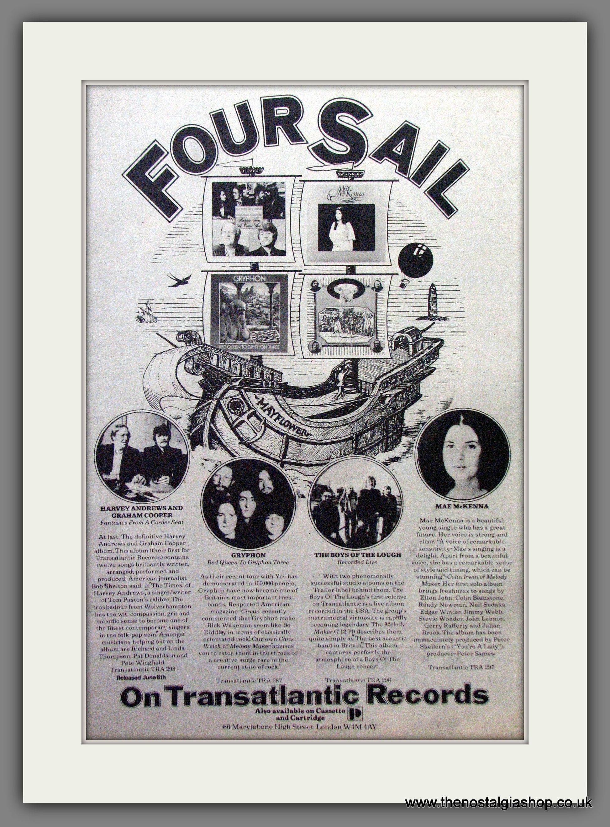 Four Sail Albums. Original Advert 1975 (ref AD13036). Presented and supplied in a cream bevel cut mount with backing card and clear bag. Ready to fit in a 20x16 inch frame. The mounted advert will be posted via courier and well packed - protected with a sheet of hardboard to keep it rigid. Any questions or enquiries, please get in touch, we are here to help! All our adverts, unless clearly stated are originals from the date shown. They make excellent pieces of wall art and stunning gifts. Many are rare and hard to find and once sold, may not be replaced. Remember you are buying a piece of history. Website watermark is not on original.
