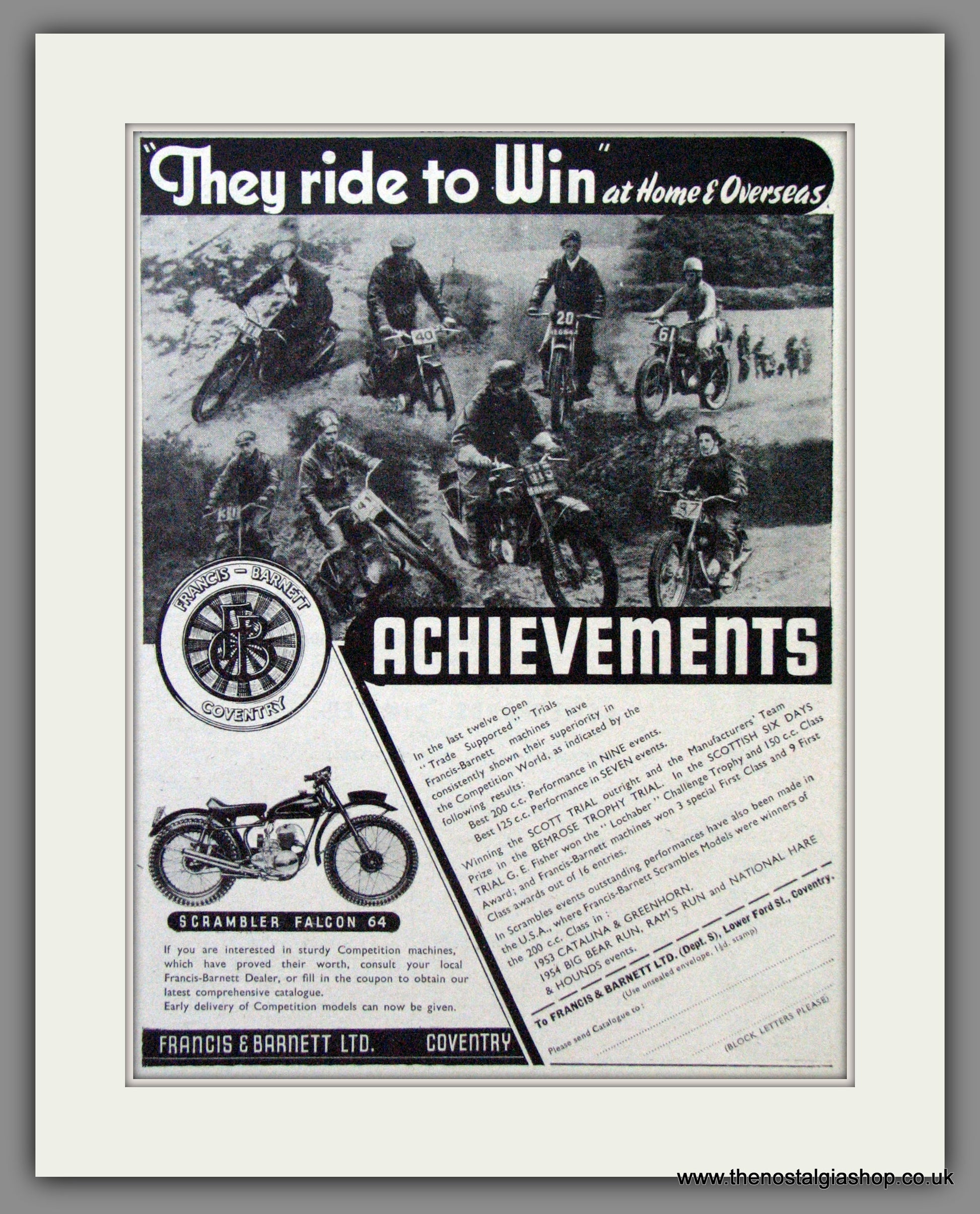 Francis Barnett Motorcycles. Falcon 64 Scrambler. Classic Original Vintage Advert 1954. Presented and Supplied in cream bevel cut mount with backing card. Ready to fit in 14 x 11 inch frame. Want it framing? If so, buy this then go to Frames Available Category. Click to buy on the suitable frame and we will do the rest. All our adverts, unless clearly stated are Originals from the date shown They make excellent pieces of wall art and stunning gifts. Many are rare and hard to find and once sold, may not be replaced. Remember you are buying a piece of history. Website watermark is not on original.