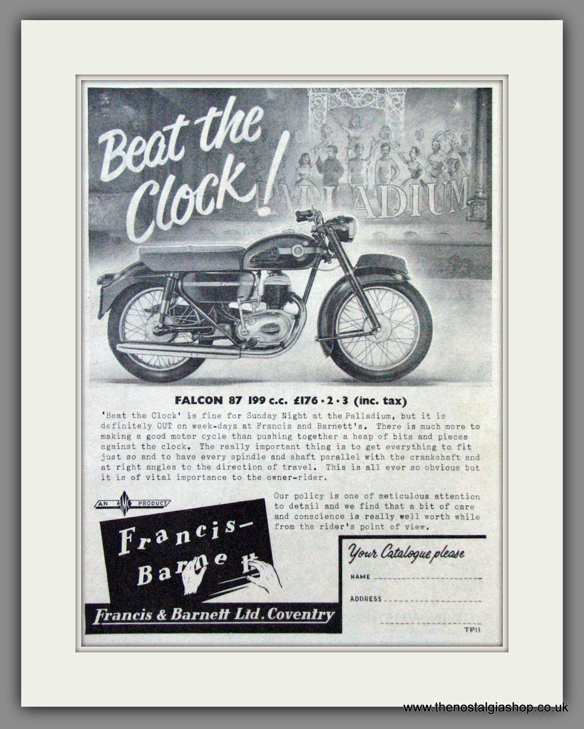 Francis Barnett Motorcycles. Falcon 87, 200cc. Classic Original Vintage Advert 1960. Presented and Supplied in cream bevel cut mount with backing card and clear bag. Ready to fit in 14 x 11 inch frame. Want it framing? If so, buy this then go to Frames Available Category. Click to buy on the suitable frame and we will do the rest. All our adverts, unless clearly stated are Originals from the date shown They make excellent pieces of wall art and stunning gifts. Many are rare and hard to find and once sold, may not be replaced. Remember you are buying a piece of history. Website watermark is not on original.