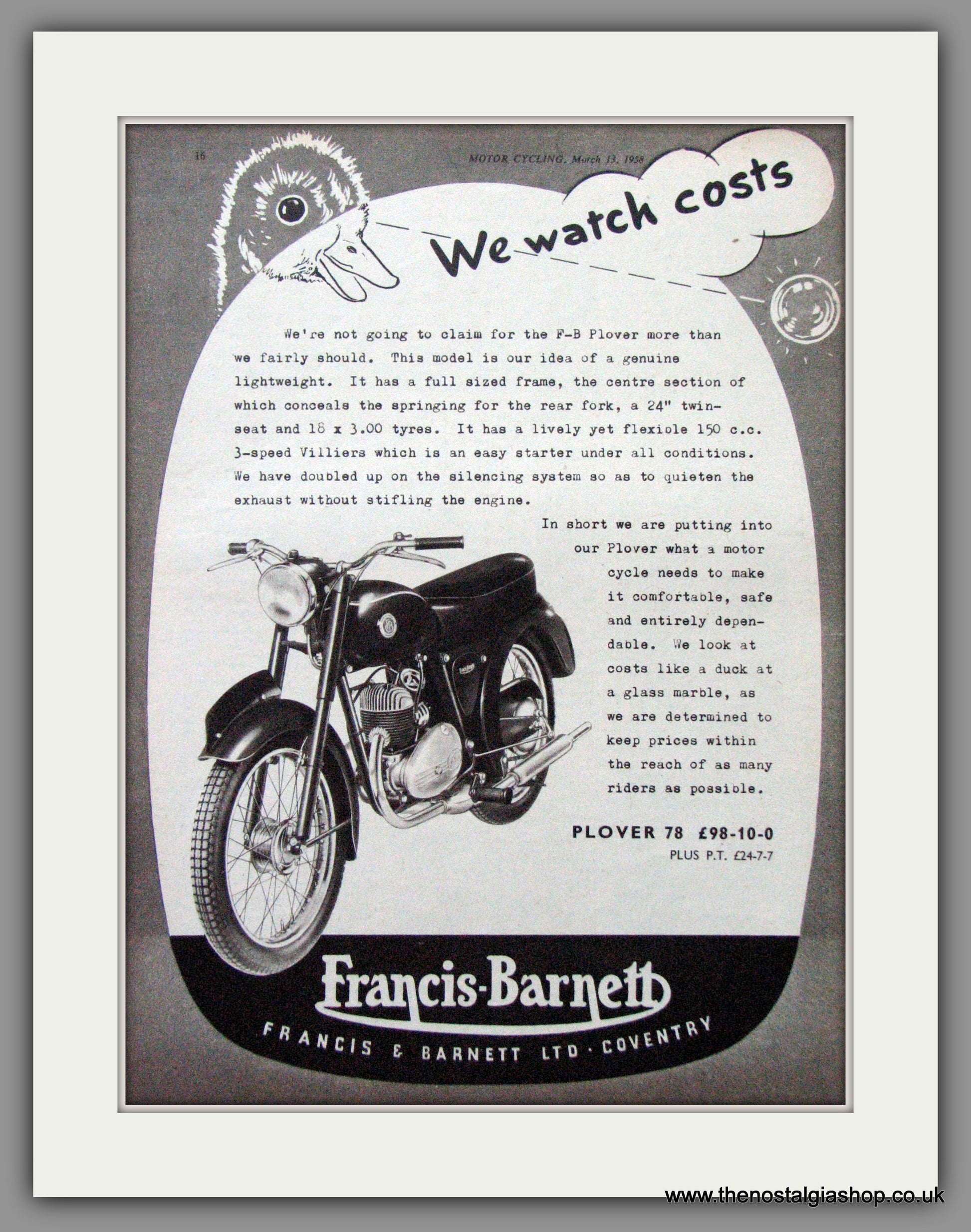 Francis Barnett Motorcycles. Plover 78. Classic Original Vintage Advert 1958. Presented and Supplied in cream bevel cut mount with backing card and clear bag. Ready to fit in 14 x 11 inch frame. Want it framing? If so, buy this then go to Frames Available Category. Click to buy on the suitable frame and we will do the rest. All our adverts, unless clearly stated are Originals from the date shown They make excellent pieces of wall art and stunning gifts. Many are rare and hard to find and once sold, may not be replaced. Remember you are buying a piece of history. Website watermark is not on original.