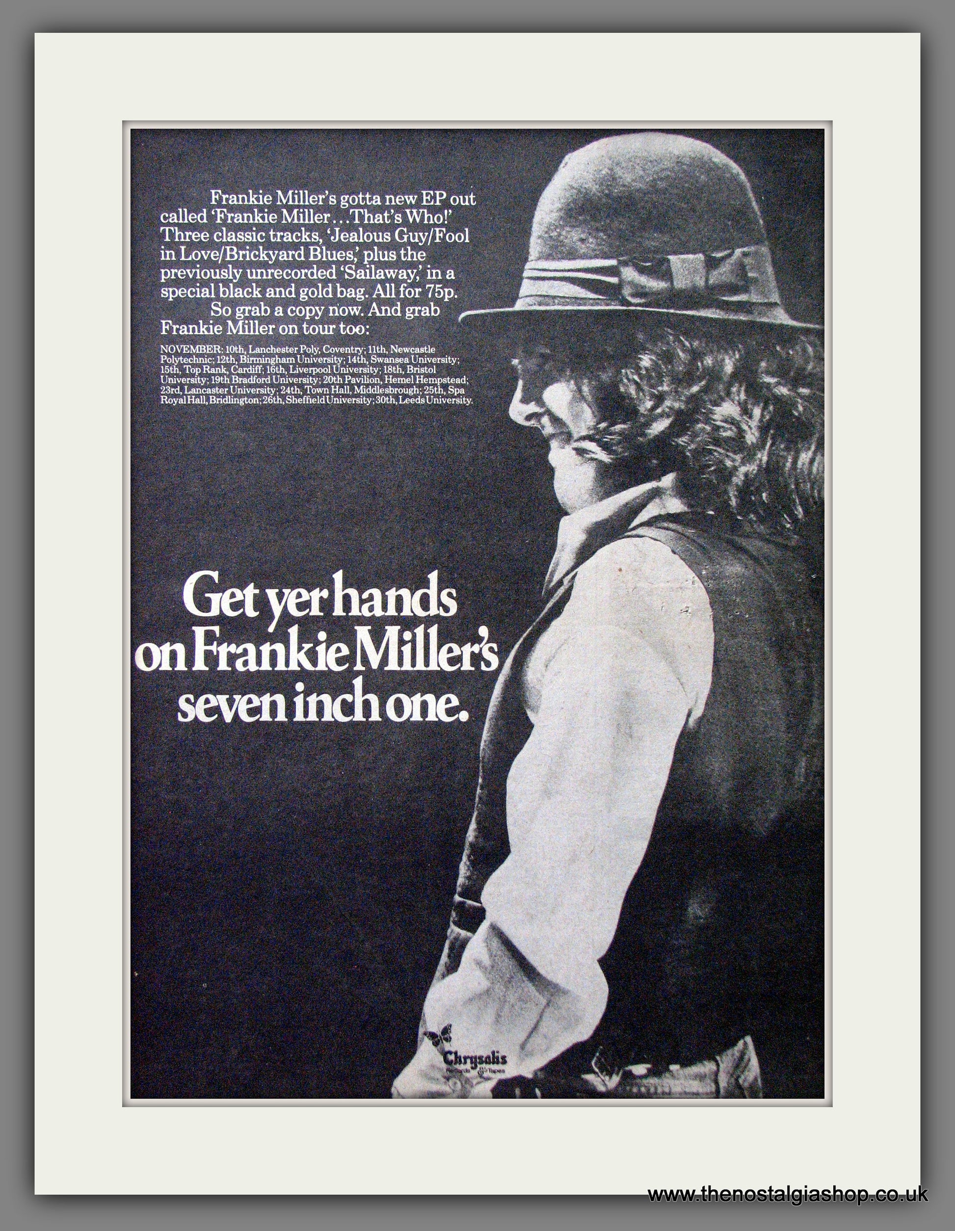 Frankie Miller On Tour. Original Advert 1977 (ref AD13101). Presented and supplied in a cream bevel cut mount with backing card and clear bag. Ready to fit in a 20x16 inch frame. The mounted advert will be posted via courier and well packed - protected with a sheet of hardboard to keep it rigid. Any questions or enquiries, please get in touch, we are here to help! All our adverts, unless clearly stated are originals from the date shown. They make excellent pieces of wall art and stunning gifts. Many are rare and hard to find and once sold, may not be replaced. Remember you are buying a piece of history. Website watermark is not on original.
