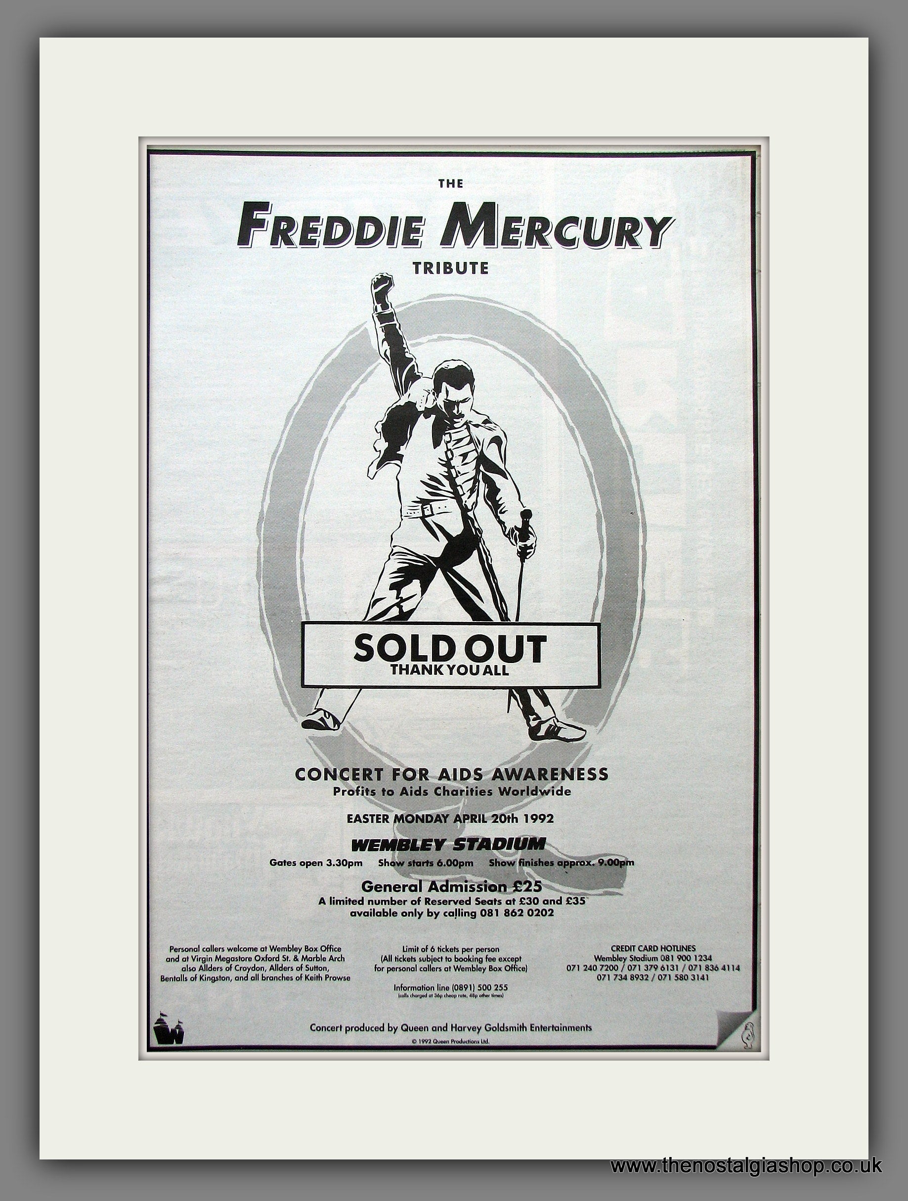 Freddie Mercury Tribute Concert, Wembley. Queen. This is a large classic Original advert 1992. Presented in cream bevel cut mount with backing card and clear bag. Ready to fit in 20 x 16 inch frame. The mounted advert will be posted via courier and well packed - protected with a sheet of hardboard to keep it rigid. Any questions or inquiries, please get in touch, we are here to help! All our adverts, unless clearly stated are Originals from the date shown. They make excellent pieces of wall art and stunning gifts. Many are rare and hard to find and once sold, may not be replaced. Remember you are buying a piece of history. Website watermark is not on original.