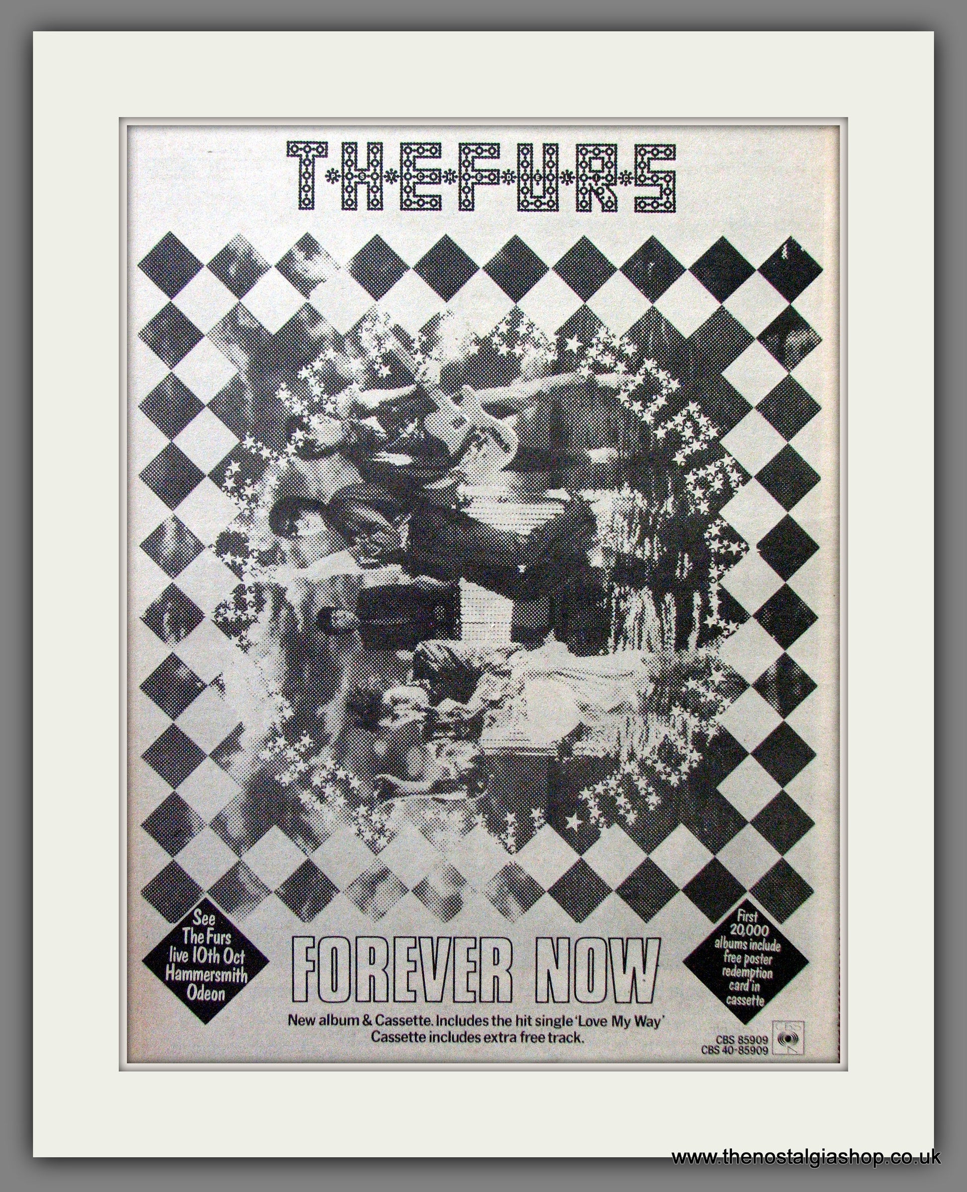 Furs (The) Forever Now. Original Advert 1982 (ref AD13044). Presented and supplied in a cream bevel cut mount with backing card and clear bag. Ready to fit in a 20x16 inch frame. The mounted advert will be posted via courier and well packed - protected with a sheet of hardboard to keep it rigid. Any questions or enquiries, please get in touch, we are here to help! All our adverts, unless clearly stated are originals from the date shown. They make excellent pieces of wall art and stunning gifts. Many are rare and hard to find and once sold, may not be replaced. Remember you are buying a piece of history. Website watermark is not on original.