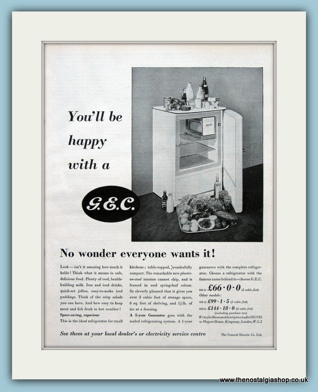 G.E.C Refrigerator. No wonder everyone wants it! Classic original advert 1955. Presented in cream bevel cut mount with backing card. Ready to fit in 14 x 11 inch frame. Want it framing? If so, buy this then go to Frames Available Catagory. Click to buy on the suitable frame and we will do the rest. All our adverts, unless clearly stated are Originals from the date shown. They make excellent pieces of wall art and stunning gifts. Many are rare and hard to find and once sold, may not be replaced. Remember you are buying a piece of history. Website watermark is not on original.