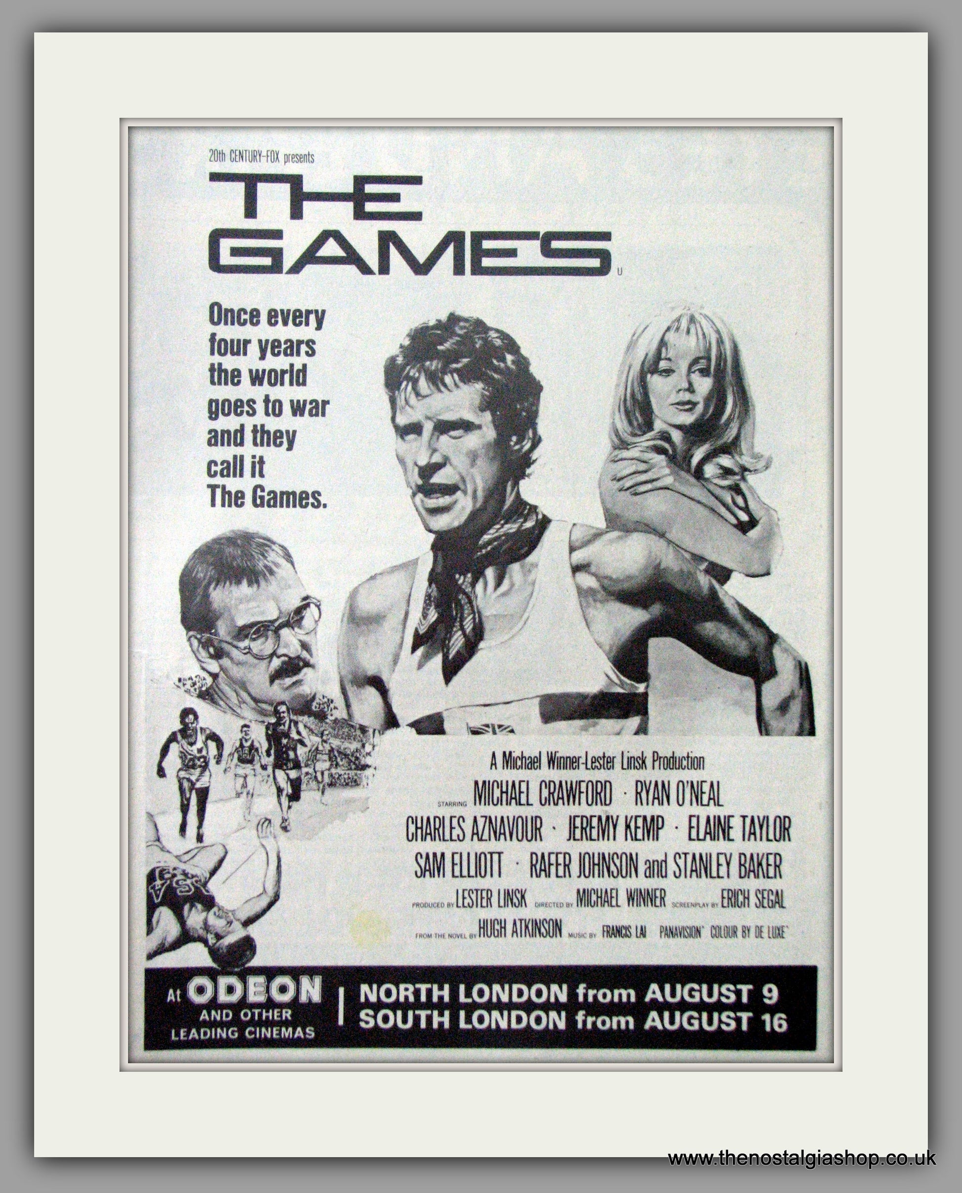 The Games-Michael Crawford, Ryan O'Neal, Charles Aznavour. Original Advert 1970. Presented in cream bevel cut mount with backing card. Ready to fit in 14 x 11 inch frame. Want it framing? If so, buy this then go to Frames Available Category. Click to buy on the suitable frame and we will do the rest. All our adverts, unless clearly stated are Originals from the date shown. They make excellent pieces of wall art and stunning gifts. Many are rare and hard to find and once sold, may not be replaced. Remember you are buying a piece of history. Website watermark is not on original.