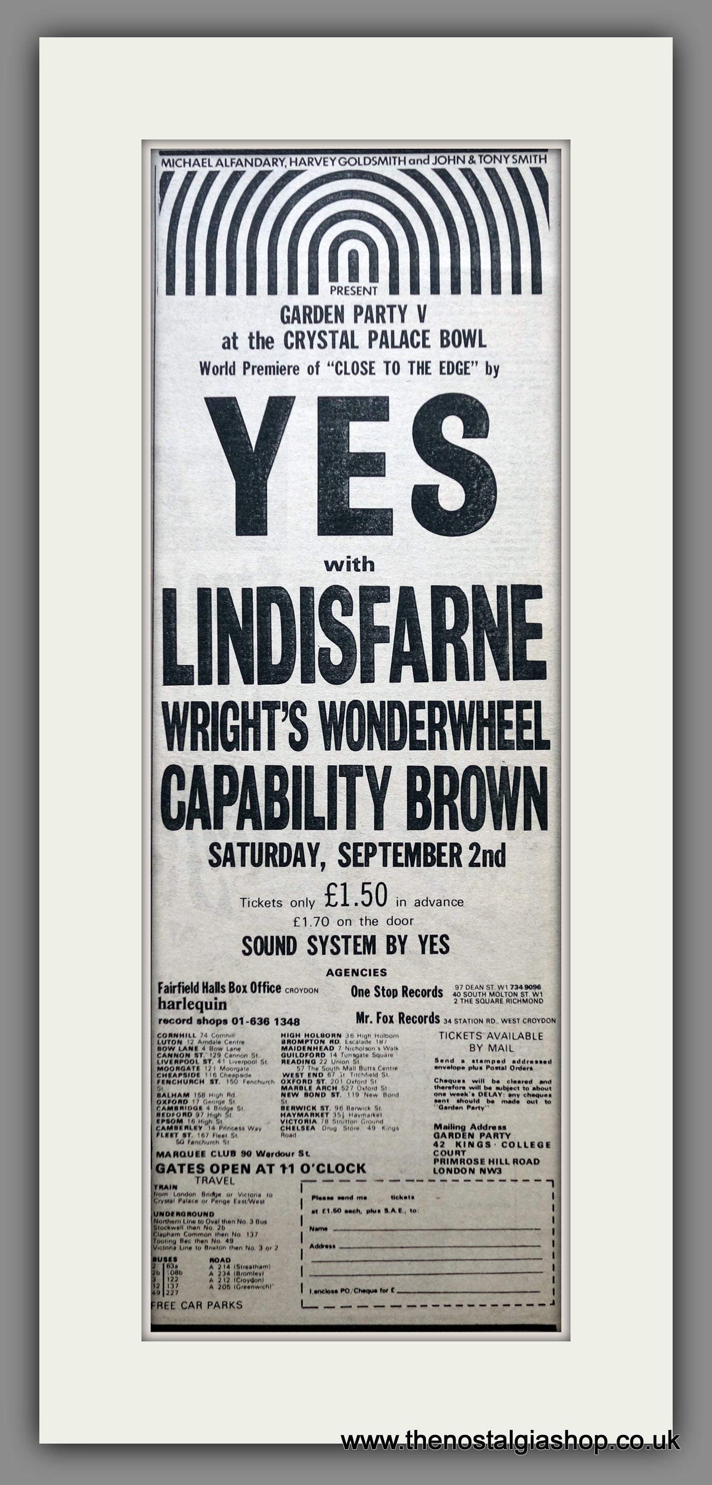 Crystal Palace Bowl Garden Party V. Yes, Lindisfarne. This is a large Original Vintage Advert 1973. Presented and Supplied in a cream, bevel cut mount with backing card and clear bag. Ready to fit in 20 x 10 inch frame. The mounted advert will be posted via courier and well packed - protected with a sheet of hardboard to keep it rigid. Any questions or inquiries, please get in touch, we are here to help! All our adverts, unless clearly stated are Originals from the date shown. They make excellent pieces of wall art and stunning gifts. Many are rare and hard to find and once sold, may not be replaced. Remember you are buying a piece of history. Website watermark is not on original.