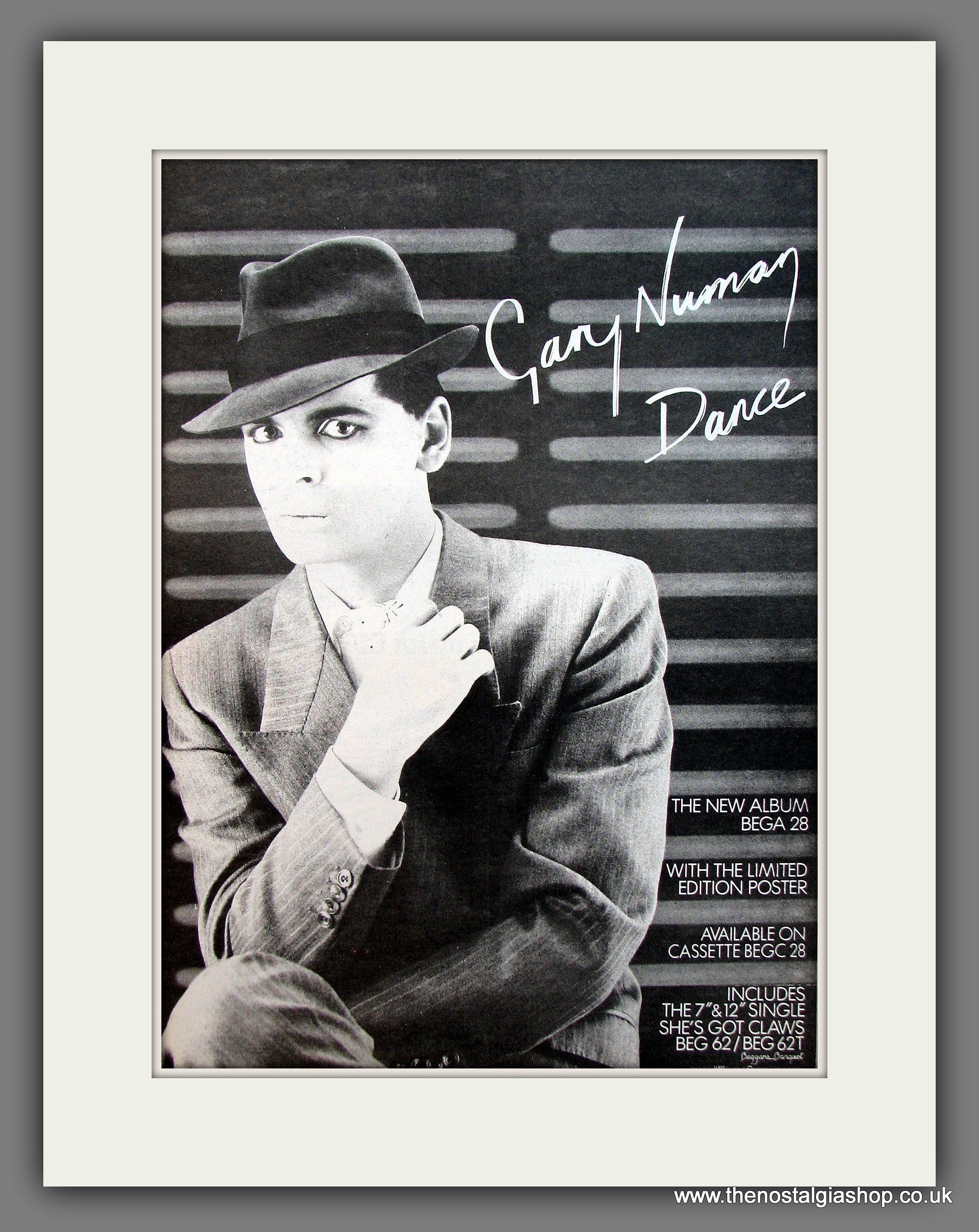 Gary Numan Dance. This is a large classic Original advert 1981. Presented in cream bevel cut mount with backing card and clear bag. Ready to fit in 20 x 16 inch frame. The mounted advert will be posted via courier and well packed - protected with a sheet of hardboard to keep it rigid. Any questions or inquiries, please get in touch, we are here to help! All our adverts, unless clearly stated are Originals from the date shown. They make excellent pieces of wall art and stunning gifts. Many are rare and hard to find and once sold, may not be replaced. Remember you are buying a piece of history. Website watermark is not on original.