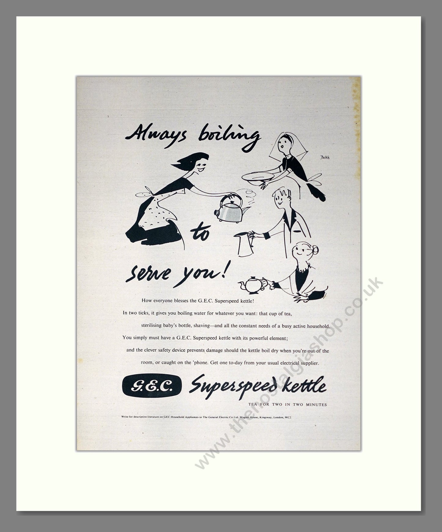 General Electric - Kettles. Vintage Advert. This is a large classic original advert from 1957. Presented and supplied in a cream bevel cut mount with backing card and clear bag. Ready to fit in a 18 x 14 inches frame. The mounted advert will be posted via courier and well packed - protected with a sheet of hardboard to keep it rigid. Any questions or enquiries, please get in touch, we are here to help! All our adverts, unless clearly stated are originals from the date shown. They make excellent pieces of wall art and stunning gifts. Many are rare and hard to find and once sold, may not be replaced. Remember you are buying a piece of history. Website watermark is not on original.