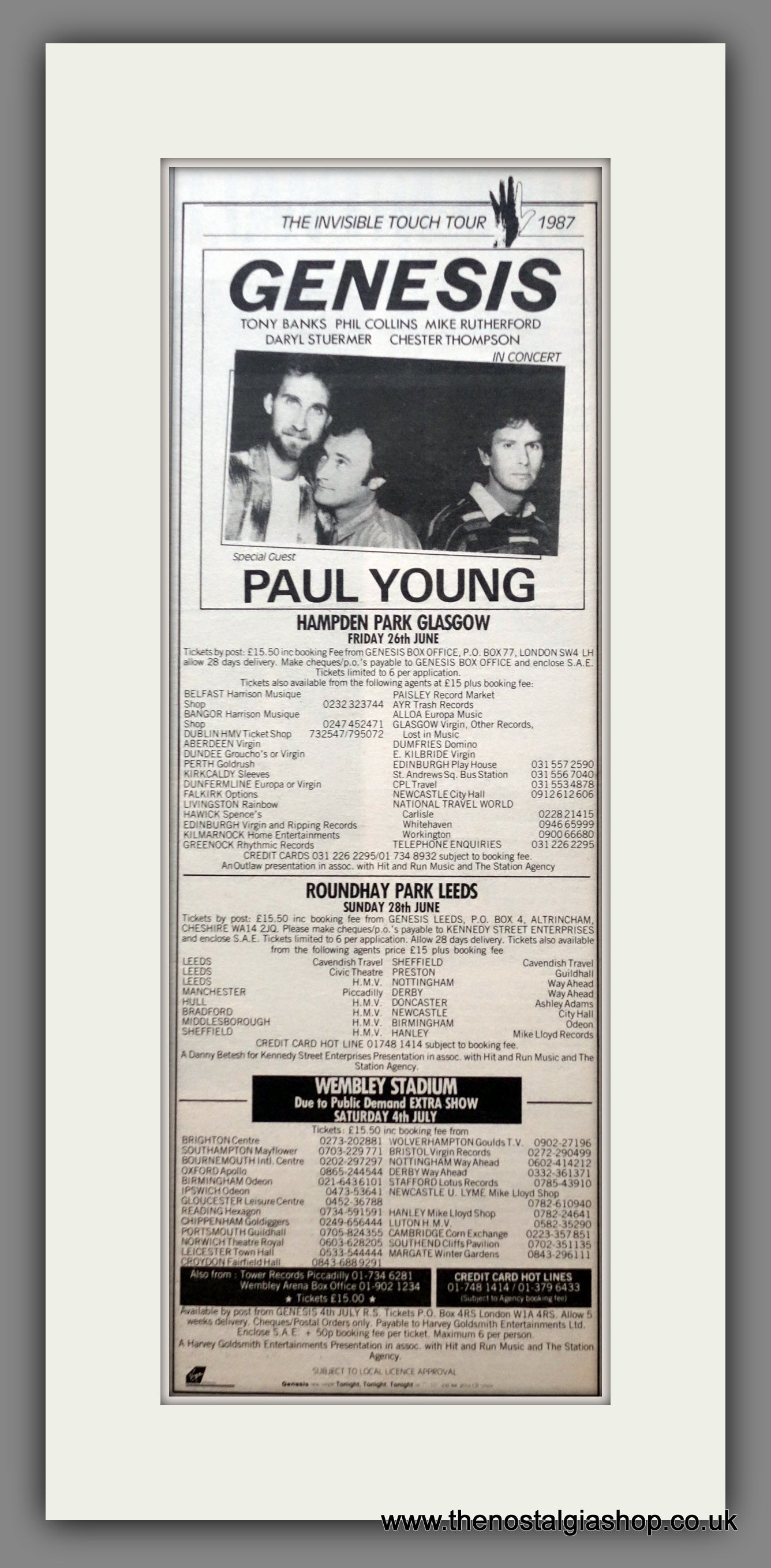 Genesis Invisible Touch Tour. This is a large Original Vintage Advert 1987. Presented and Supplied in a cream, bevel cut mount with backing card and clear bag. Ready to fit in 20 x 10 inch frame. The mounted advert will be posted via courier and well packed - protected with a sheet of hardboard to keep it rigid. Any questions or inquiries, please get in touch, we are here to help! All our adverts, unless clearly stated are Originals from the date shown. They make excellent pieces of wall art and stunning gifts. Many are rare and hard to find and once sold, may not be replaced. Remember you are buying a piece of history. Website watermark is not on original.