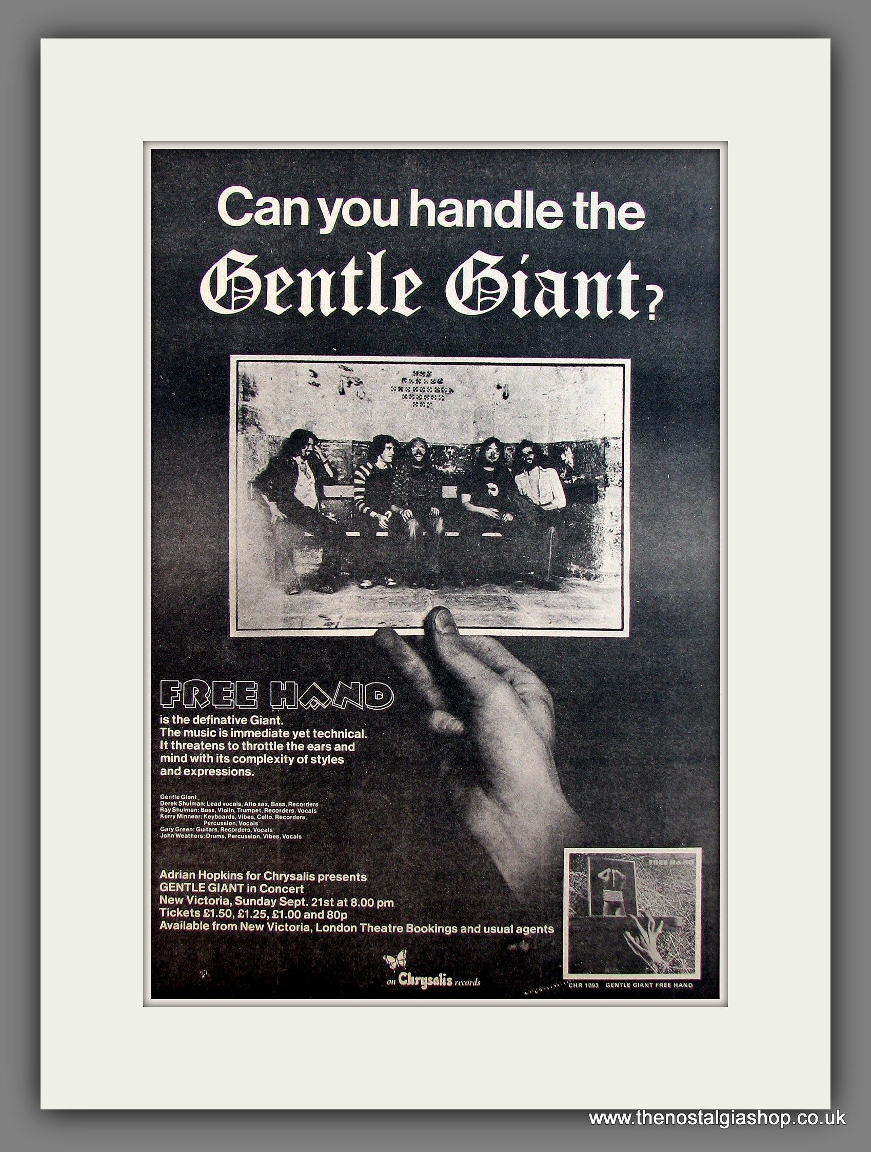 Gentle Giant Free Hand. Original advert from 1975. Presented and Supplied in cream bevel cut mount with backing card. Ready to fit in 20 x 16 inch frame. All our adverts, unless clearly stated are Originals from the date shown They make excellent pieces of wall art and stunning gifts. Many are rare and hard to find and once sold, may not be replaced. Remember you are buying a piece of history. Website watermark is not on original.