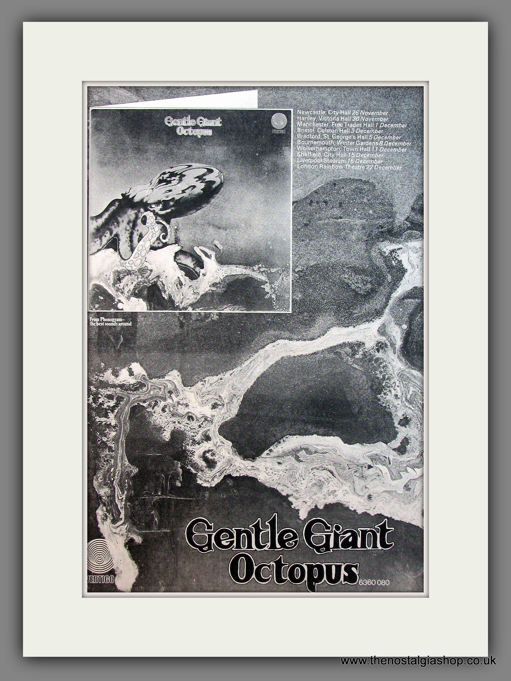 Gentle Giant Octopus. This is a large classic Original advert 1972. Presented in cream bevel cut mount with backing card and clear bag. Ready to fit in 20 x 16 inch frame. The mounted advert will be posted via courier and well packed - protected with a sheet of hardboard to keep it rigid. Any questions or inquiries, please get in touch, we are here to help! All our adverts, unless clearly stated are Originals from the date shown. They make excellent pieces of wall art and stunning gifts. Many are rare and hard to find and once sold, may not be replaced. Remember you are buying a piece of history. Website watermark is not on original.