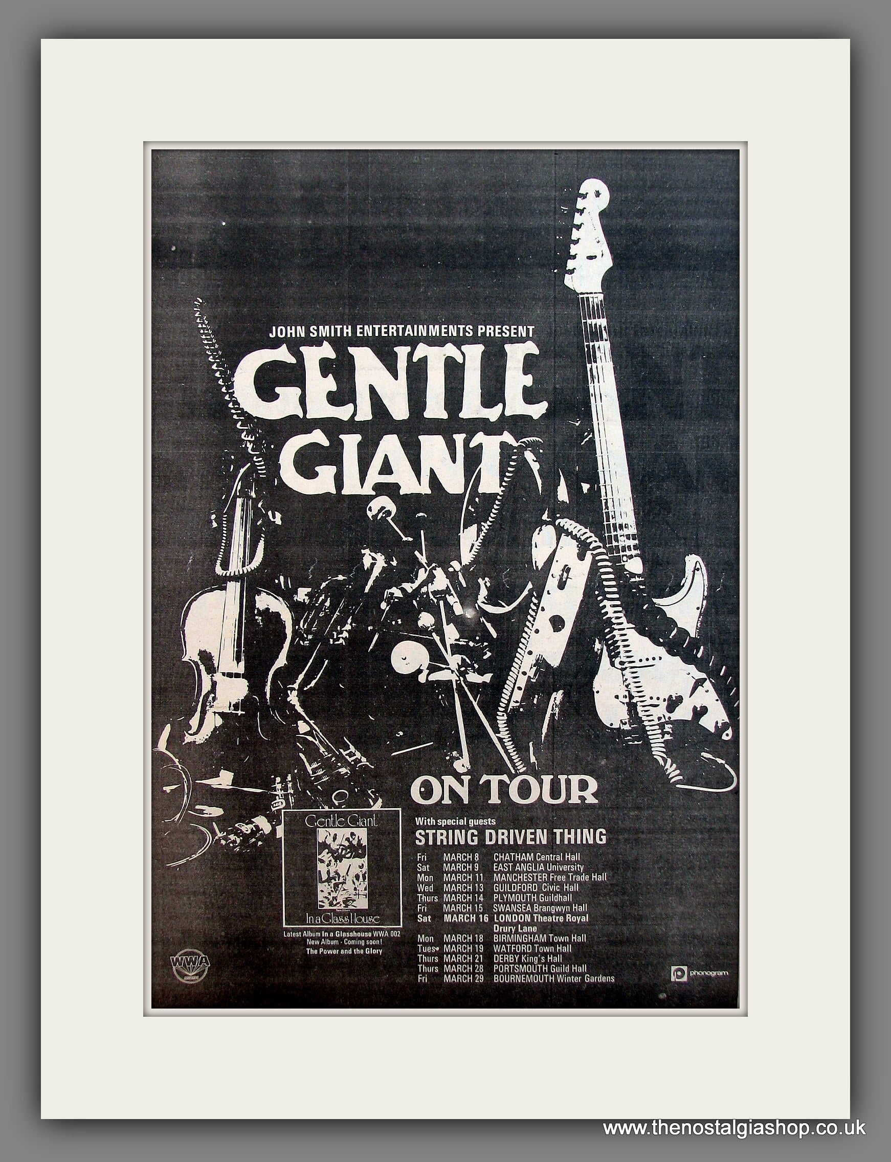 Gentle Giants On Tour. Original advert from 1974. Presented and Supplied in cream bevel cut mount with backing card. Ready to fit in 20 x 16 inch frame. All our adverts, unless clearly stated are Originals from the date shown They make excellent pieces of wall art and stunning gifts. Many are rare and hard to find and once sold, may not be replaced. Remember you are buying a piece of history. Website watermark is not on original.