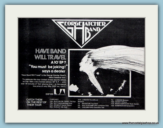 George Hatcher Band. Have Band Will Travel, Debut Headline Tour. Classic original advert 1977. (this advert has slight writing on) Presented in cream bevel cut mount with backing card. Ready to fit in 14 x 11 inch frame. Want it framing? If so, buy this then go to Frames Available Category. Click to buy on the suitable frame and we will do the rest. All our adverts, unless clearly stated are Originals from the date shown. They make excellent pieces of wall art and stunning gifts. Many are rare and hard to find and once sold, may not be replaced. Remember you are buying a piece of history. Website watermark is not on original.