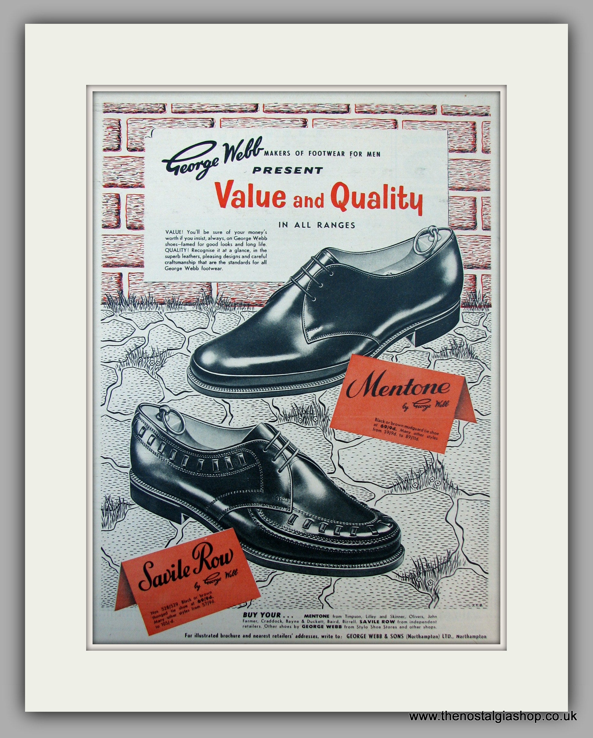 George Webb Footwear. Vintage Advert. Original advert from 1957. Presented in cream bevel cut mount with backing board and clear bag. Size of the Mount is 18 x 14 Inches. The perfect gift.- These adverts are all taken from Original publications of the dates stated. They are NOT modern reprints. Many are difficult to get hold of ,some are very rare and once sold may not be replaced, Remember, you are buying a piece of historic nostalgia. Lots more adverts available. Please contact us if you don't see the advert you want.