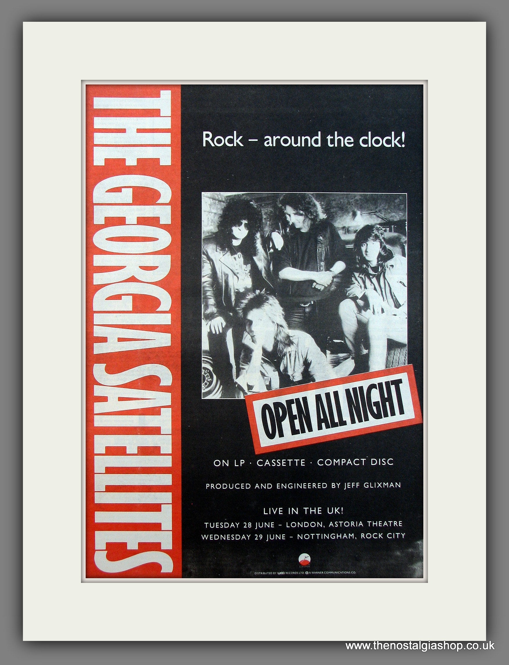 The Georgia Satellites Open All Night. This is a classic Original advert 1988. Presented in cream bevel cut mount with backing card and clear bag. Ready to fit in 14 x 11 inch frame. The mounted advert will be posted via courier and well packed - protected with a sheet of hardboard to keep it rigid. Any questions or inquiries, please get in touch, we are here to help! All our adverts, unless clearly stated are Originals from the date shown. They make excellent pieces of wall art and stunning gifts. Many are rare and hard to find and once sold, may not be replaced. Remember you are buying a piece of history. Website watermark is not on original.