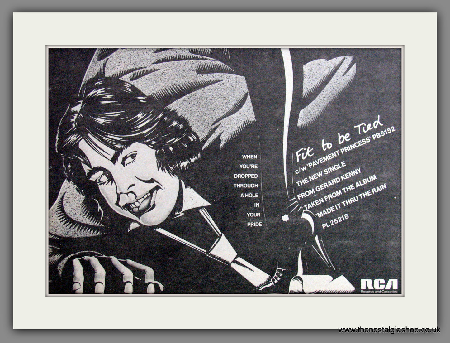 Gerard Kenny, Fit To Be Tied. Classic original advert 1979. Presented and Supplied in a cream bevel cut mount with backing card and clear bag. Ready to fit in 14 x 11 inch frame. Want it framing? If so, buy this then go to Frames Available Category. Click to buy on the suitable frame and we will do the rest. All our adverts, unless clearly stated are Originals from the date shown. They make excellent pieces of wall art and stunning gifts. Many are rare and hard to find and once sold, may not be replaced. Remember you are buying a piece of history. Website watermark is not on original.