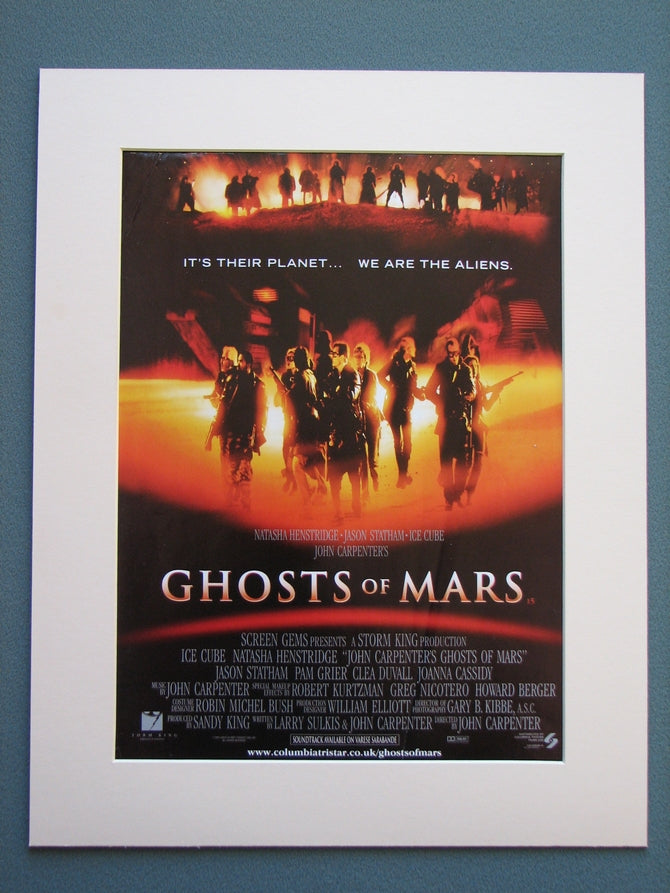 Ghosts Of Mars Ice Cube, Natasha Henstridge, Jason Statham, Pam Grier. Classic original advert 2001. Presented in cream bevel cut mount with backing card. Ready to fit in 14 x 11 inch frame. Want it framing? buy this then go to Frames Available Category. Click to buy on the suitable frame and we will do the rest. All our adverts, unless clearly stated are Originals from the date shown They make excellent pieces of wall art and stunning gifts. Many are rare and hard to find and once sold, may not be replaced. Remember you are buying a piece of history.