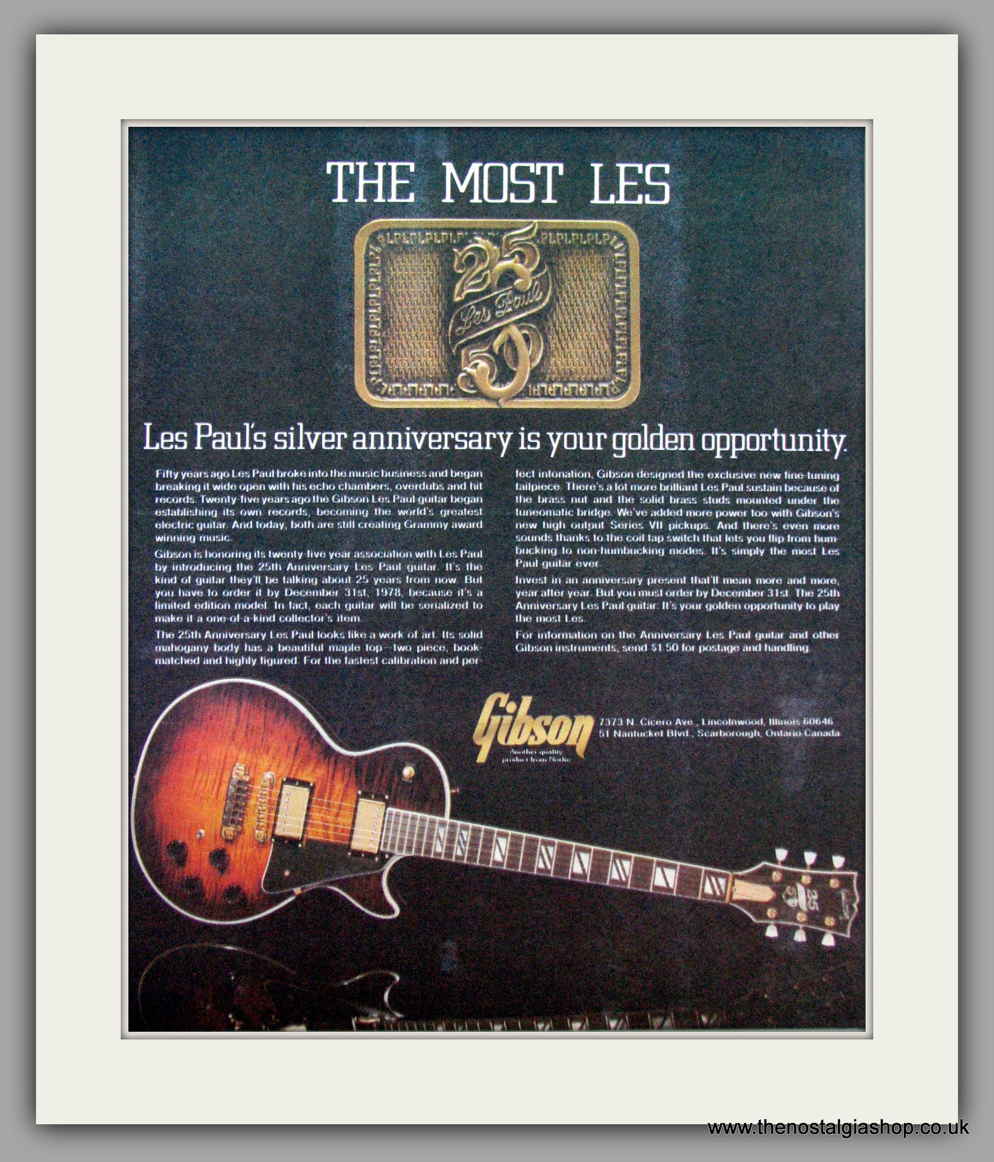 Gibson Guitars. Les Paul's silver Anniversary. Original Advert 1978 (ref AD9486). Presented and supplied in a cream bevel cut mount with backing card and clear bag. Ready to fit in a 20x16 inch frame. The mounted advert will be posted via courier and well packed - protected with a sheet of hardboard to keep it rigid. Any questions or enquiries, please get in touch, we are here to help! All our adverts, unless clearly stated are originals from the date shown. They make excellent pieces of wall art and stunning gifts. Many are rare and hard to find and once sold, may not be replaced. Remember you are buying a piece of history. Website watermark is not on original.