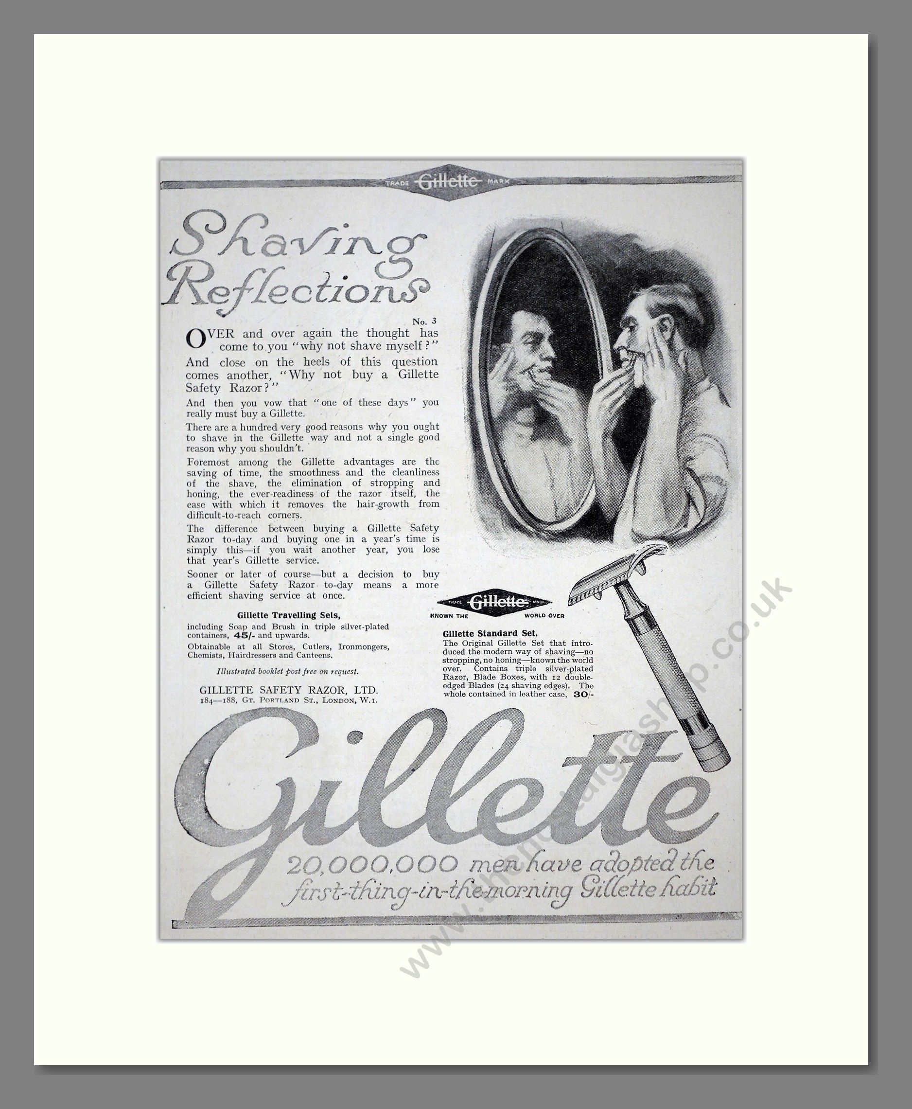 Gillette - Safety Razor. Vintage Advert. This is a classic original advert from 1920. Presented and supplied in a cream bevel cut mount with backing card and clear bag. Ready to fit in a 14 x 11 inches frame. The mounted advert will be posted via courier and well packed - protected with a sheet of hardboard to keep it rigid. Any questions or enquiries, please get in touch, we are here to help! All our adverts, unless clearly stated are originals from the date shown. They make excellent pieces of wall art and stunning gifts. Many are rare and hard to find and once sold, may not be replaced. Remember you are buying a piece of history. Website watermark is not on original.