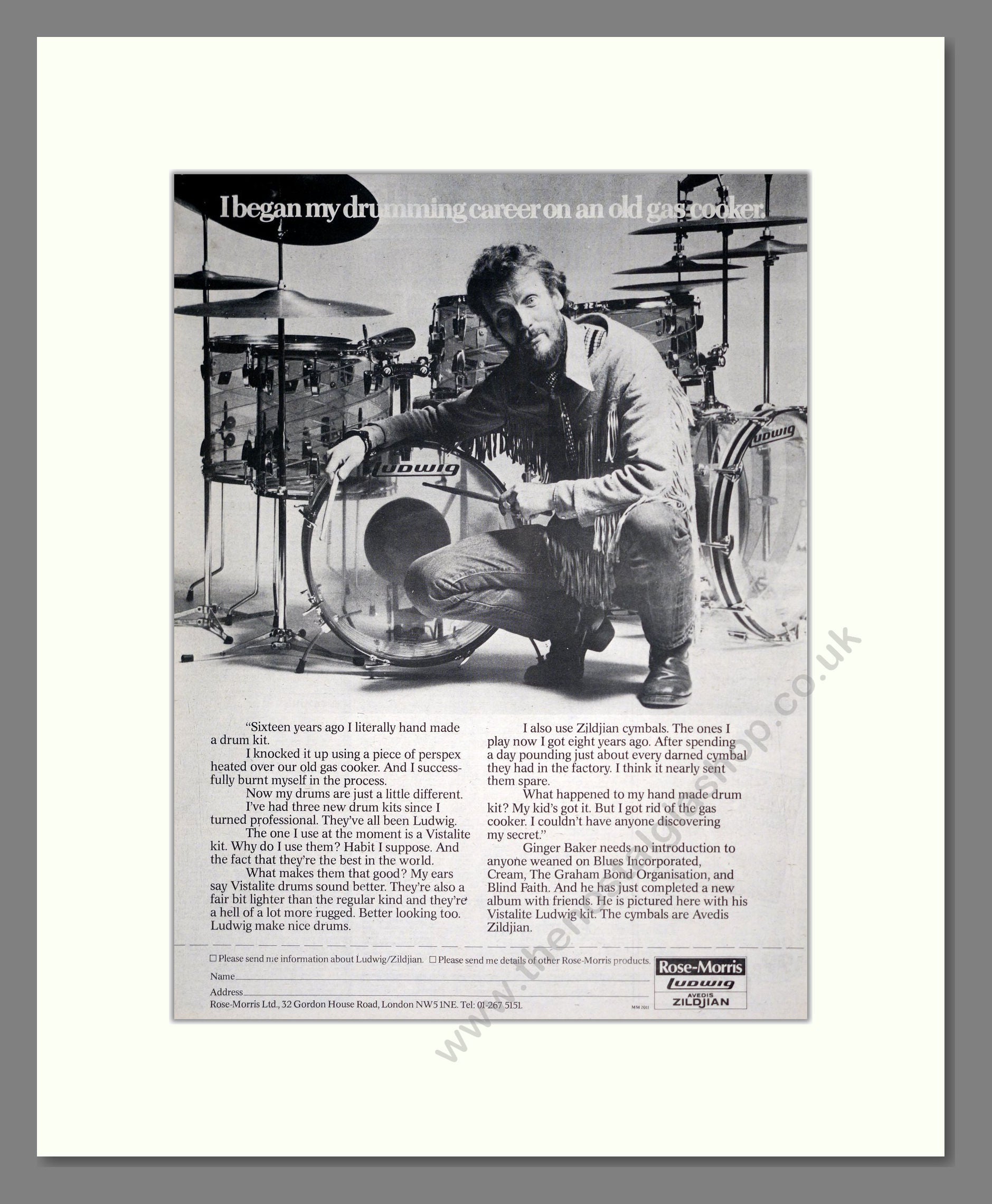 Ginger Baker - Ludwig Drums. Vintage Advert. This is a large classic original advert from 1976. Presented and supplied in a cream bevel cut mount with backing card and clear bag. Ready to fit in a 20 x 16 inches frame. The mounted advert will be posted via courier and well packed - protected with a sheet of hardboard to keep it rigid. Any questions or enquiries, please get in touch, we are here to help! All our adverts, unless clearly stated are originals from the date shown. They make excellent pieces of wall art and stunning gifts. Many are rare and hard to find and once sold, may not be replaced. Remember you are buying a piece of history. Website watermark is not on original.