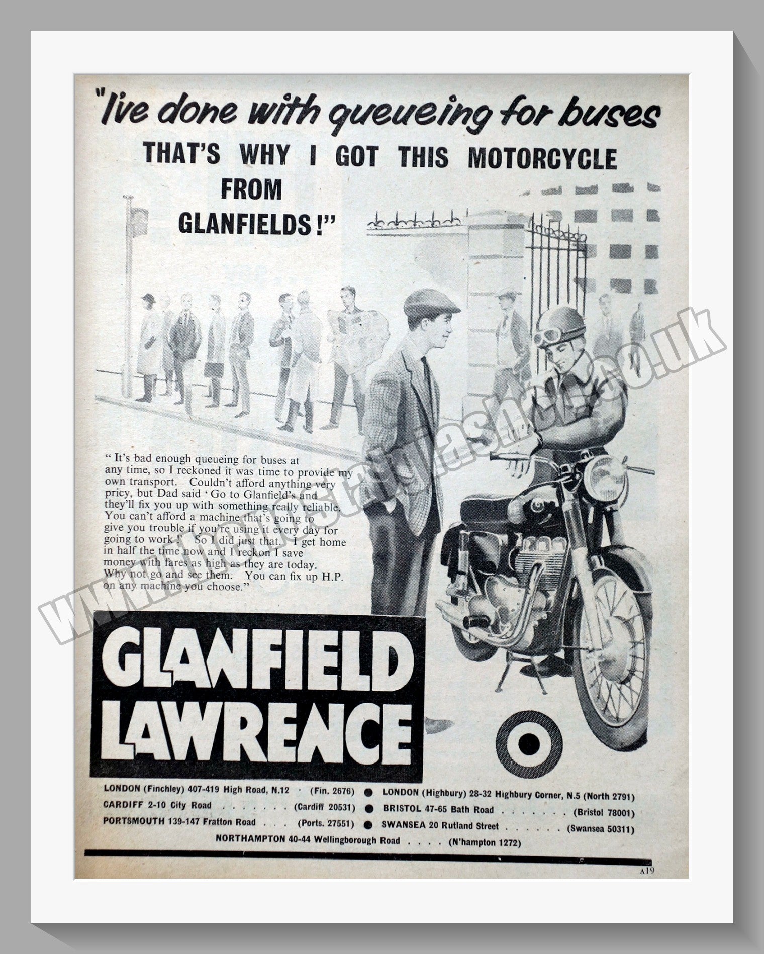 Glanfield Lawrence Motorcycle Dealership. Classic Original Advert 1960. Presented and Supplied in a 14 x 11 Inch, cream bevel cut mount with backing card and clear bag. Ready to frame. All our adverts, unless clearly stated are Originals from the date shown They make excellent pieces of wall art and stunning gifts. Many are rare and hard to find and once sold, may not be replaced. Remember you are buying a piece of history. Website watermark is not on original. Vintage Motorcycle Dealerships.