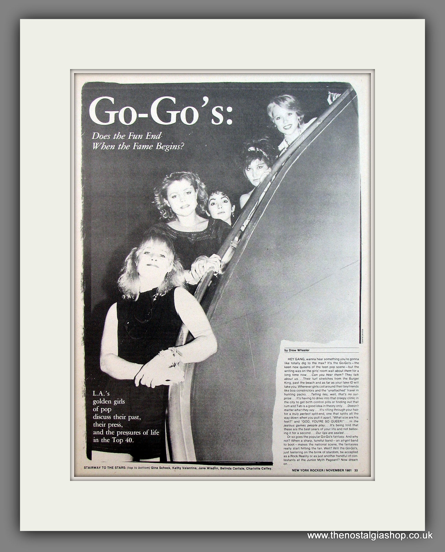 Go Go's Does The Fun End When The Fame Begins. This is a large classic Original advert 1981. Presented in cream bevel cut mount with backing card and clear bag. Ready to fit in 20 x 16 inch frame. The mounted advert will be posted via courier and well packed - protected with a sheet of hardboard to keep it rigid. Any questions or inquiries, please get in touch, we are here to help! All our adverts, unless clearly stated are Originals from the date shown. They make excellent pieces of wall art and stunning gifts. Many are rare and hard to find and once sold, may not be replaced. Remember you are buying a piece of history. Website watermark is not on original.