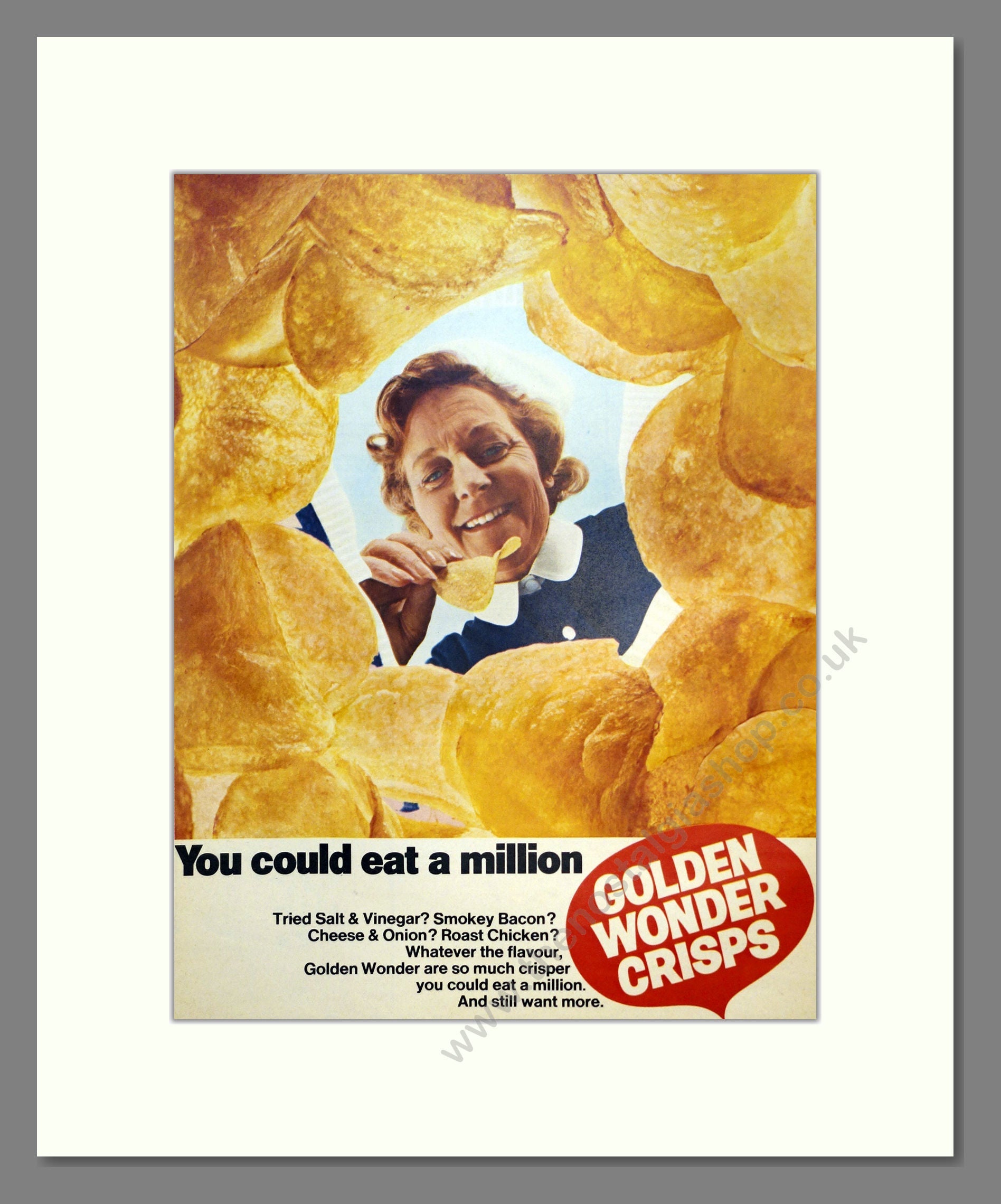 Golden Wonder Crisps. Vintage Advert. This is a large classic original advert from 1969. Presented and supplied in a cream bevel cut mount with backing card and clear bag. Ready to fit in a 18 x 14 inch frame. The mounted advert will be posted via courier and well packed - protected with a sheet of hardboard to keep it rigid. Any questions or enquiries, please get in touch, we are here to help! All our adverts, unless clearly stated are originals from the date shown. They make excellent pieces of wall art and stunning gifts. Many are rare and hard to find and once sold, may not be replaced. Remember you are buying a piece of history. Website watermark is not on original.