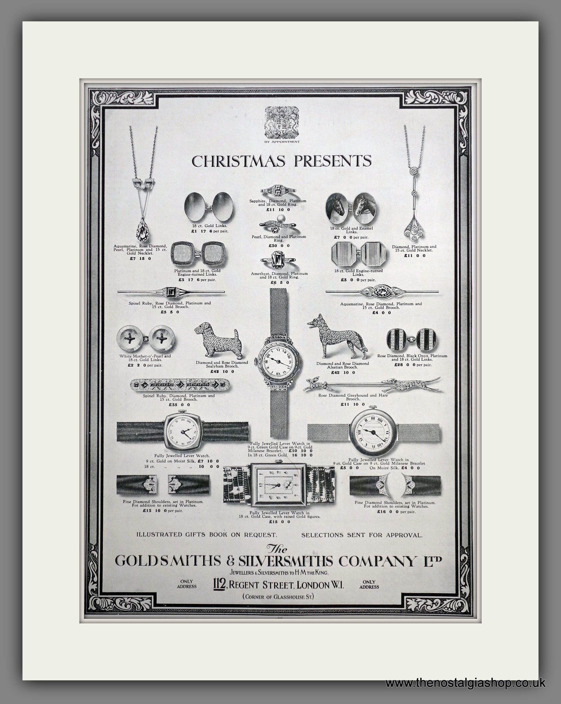 The Goldsmiths and Silversmiths Co. Ltd. Watches, Jewellery & Gifts. Original Vintage Advert 1927. Presented and supplied in a cream bevel cut mount with backing card and clear bag. Ready to fit in 18 x 14 inch frame. All our adverts, unless clearly stated are Originals from the date shown. They make excellent pieces of wall art and stunning gifts. Many are rare and hard to find and once sold, may not be replaced. Remember you are buying a piece of history. Website watermark is not on original.