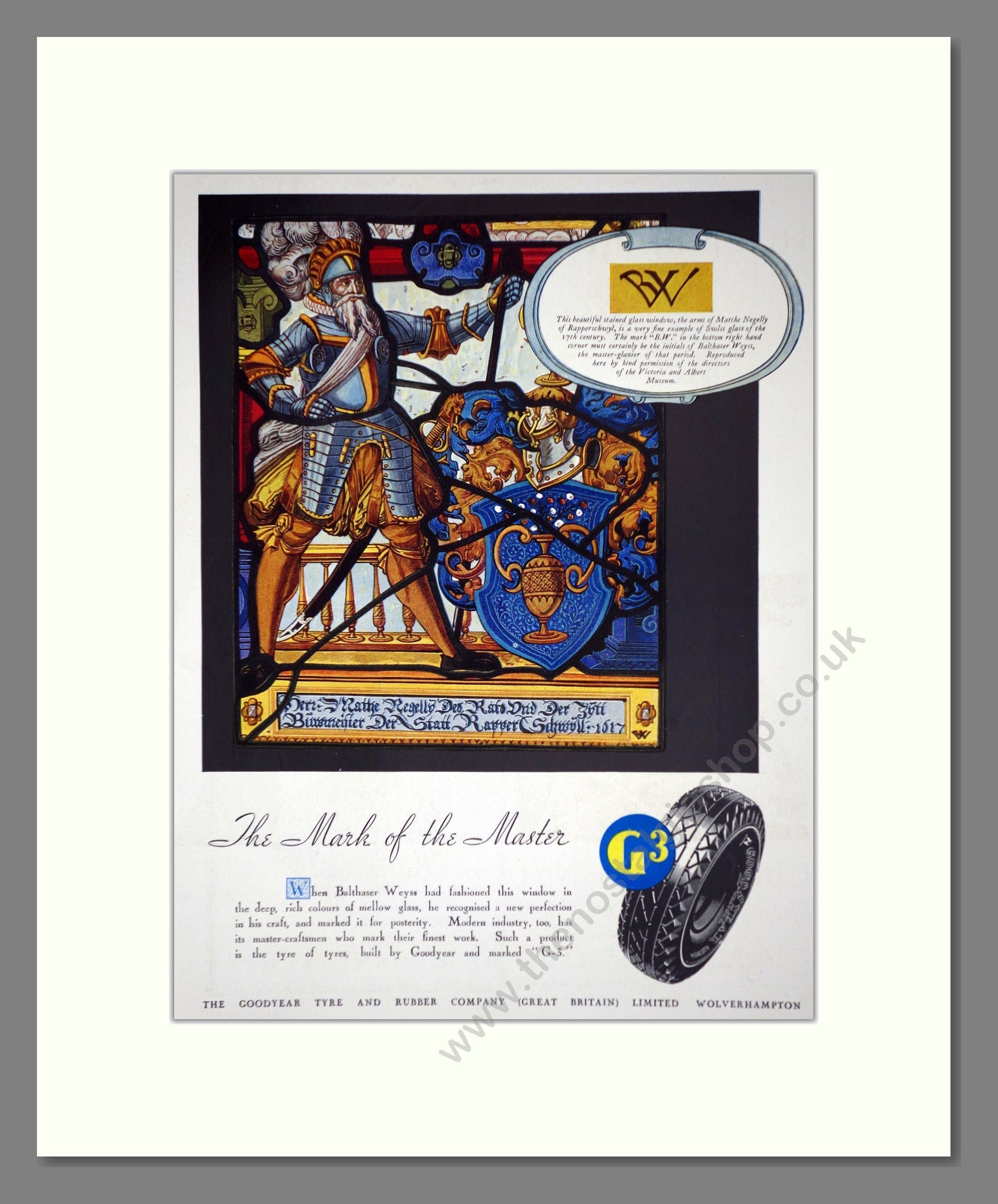Goodyear - G3 All Weather. Vintage Advert. This is a classic original advert from 1935. Presented and supplied in a cream bevel cut mount with backing card and clear bag. Ready to fit in a 14 x 11 inches frame. The mounted advert will be posted via courier and well packed - protected with a sheet of hardboard to keep it rigid. Any questions or enquiries, please get in touch, we are here to help! All our adverts, unless clearly stated are originals from the date shown. They make excellent pieces of wall art and stunning gifts. Many are rare and hard to find and once sold, may not be replaced. Remember you are buying a piece of history. Website watermark is not on original. Vintage Tyres, Vintage Wheels