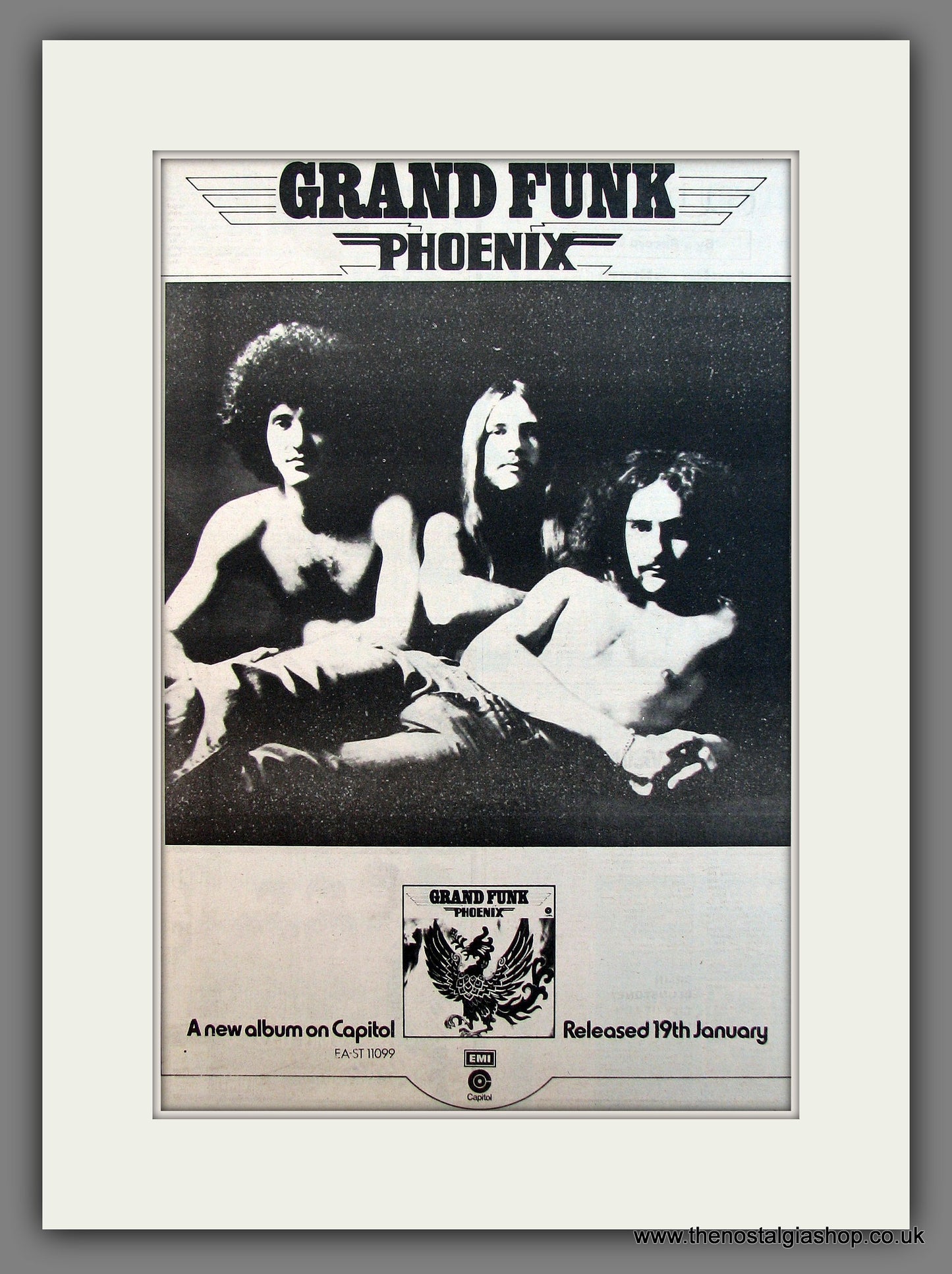 Grand Funk Phoenix. This is a large classic Original advert 1973. Presented in cream bevel cut mount with backing card and clear bag. Ready to fit in 20 x 16 inch frame. The mounted advert will be posted via courier and well packed - protected with a sheet of hardboard to keep it rigid. Any questions or inquiries, please get in touch, we are here to help! All our adverts, unless clearly stated are Originals from the date shown. They make excellent pieces of wall art and stunning gifts. Many are rare and hard to find and once sold, may not be replaced. Remember you are buying a piece of history. Website watermark is not on original.