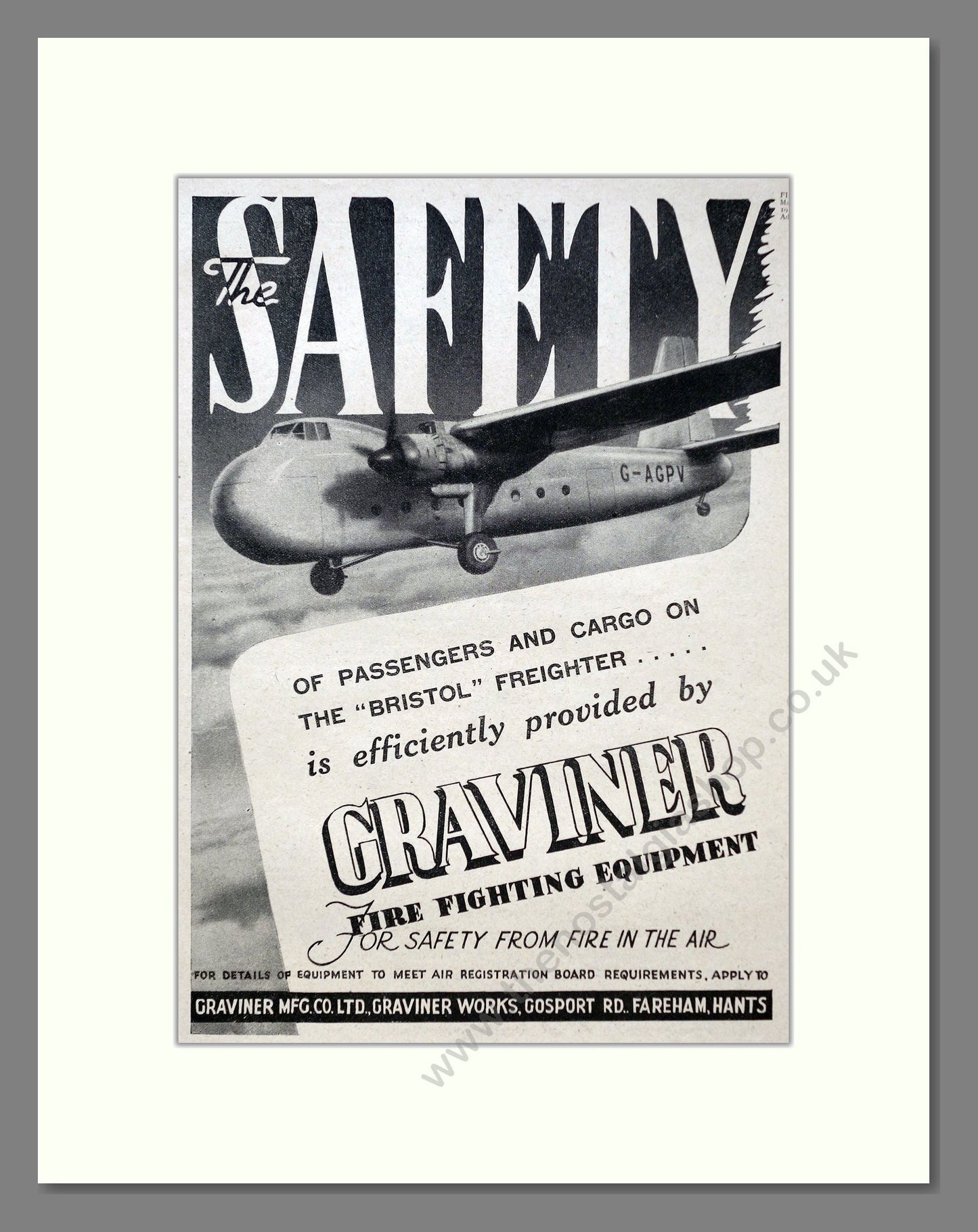 Graviner - Fire Fighting Equipment. Vintage Advert. This is a classic original advert from 1946. Presented and supplied in a cream bevel cut mount with backing card and clear bag. Ready to fit in a 14 x 11 inches frame. The mounted advert will be posted via courier and well packed - protected with a sheet of hardboard to keep it rigid. Any questions or enquiries, please get in touch, we are here to help! All our adverts, unless clearly stated are originals from the date shown. They make excellent pieces of wall art and stunning gifts. Many are rare and hard to find and once sold, may not be replaced. Remember you are buying a piece of history. Website watermark is not on original.