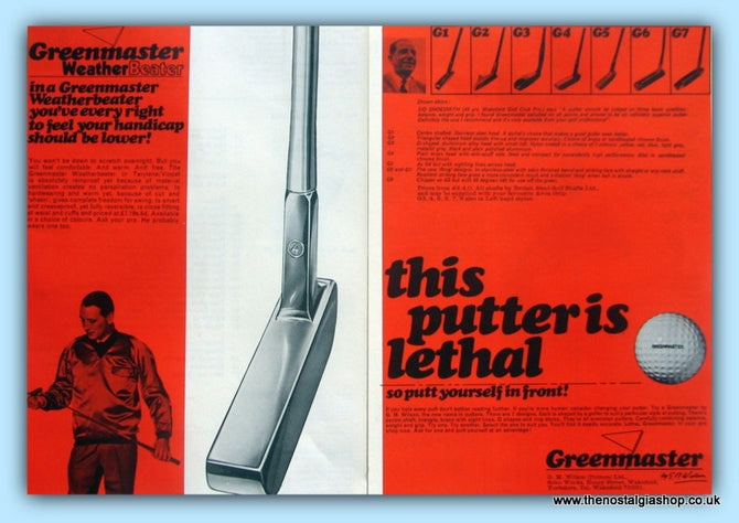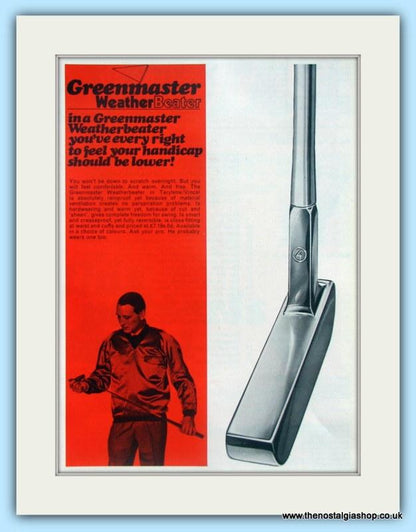 Greenmaster Weather Beater Jacket and Putters. Putt yourself in front. Classic original advert 1968. This is a double advert in 2 halves. Each half is presented in cream bevel cut mount with backing card and clear bag. Each is ready to fit in 14 x 11 inch frame. Want them framing? If so, buy this then go to Frames Available Category. Click to buy on the suitable frame(s) and we will do the rest. All our adverts, unless clearly stated are Originals from the date shown They make excellent pieces of wall art and stunning gifts. Many are rare and hard to find and once sold, may not be replaced. Remember you are buying a piece of history. Website watermark is not on original.