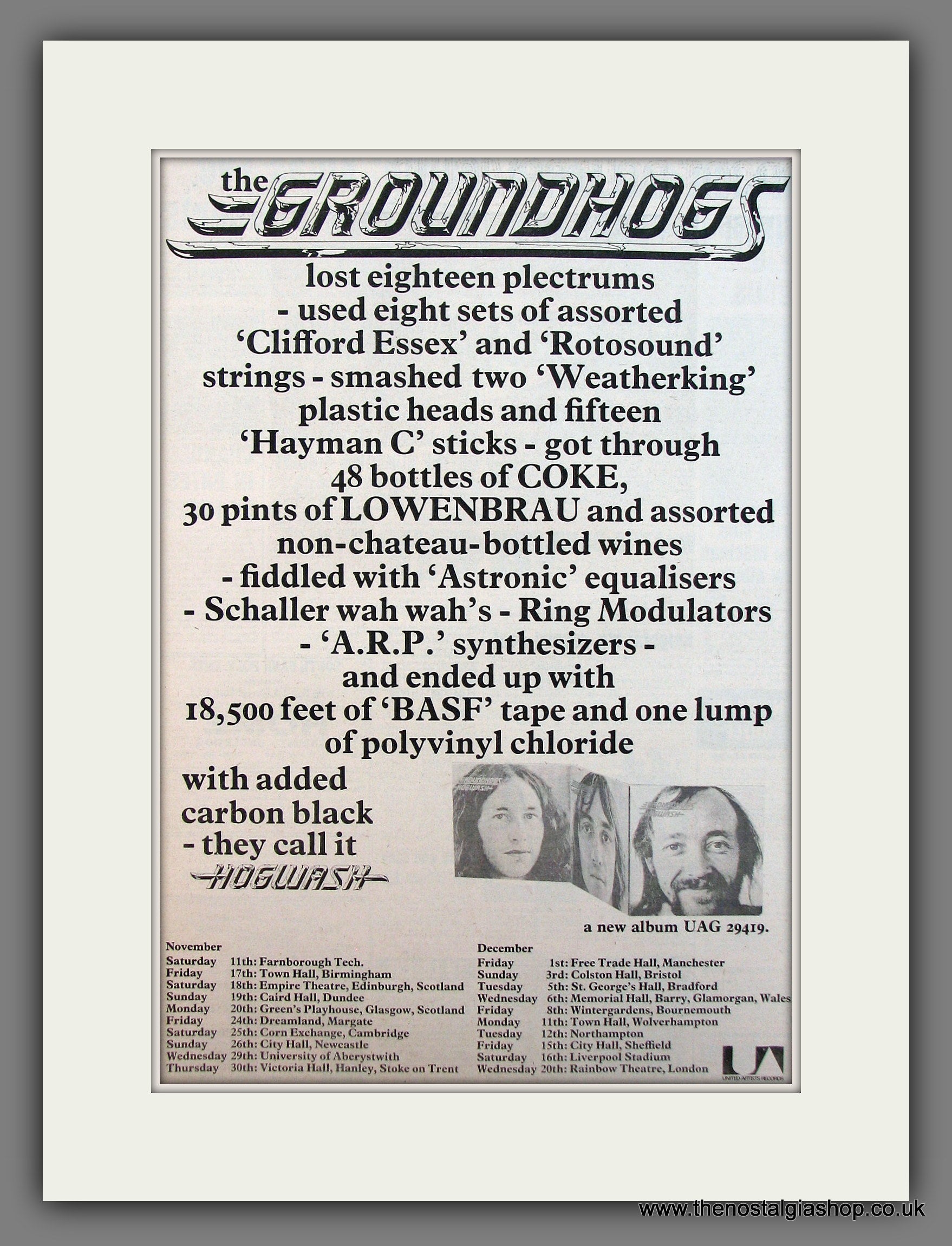 Groundhogs (The) Tour Dates. This is a large classic Original advert 1972. Presented in cream bevel cut mount with backing card and clear bag. Ready to fit in 20 x 16 inch frame. The mounted advert will be posted via courier and well packed - protected with a sheet of hardboard to keep it rigid. Any questions or inquiries, please get in touch, we are here to help! All our adverts, unless clearly stated are Originals from the date shown. They make excellent pieces of wall art and stunning gifts. Many are rare and hard to find and once sold, may not be replaced. Remember you are buying a piece of history. Website watermark is not on original.