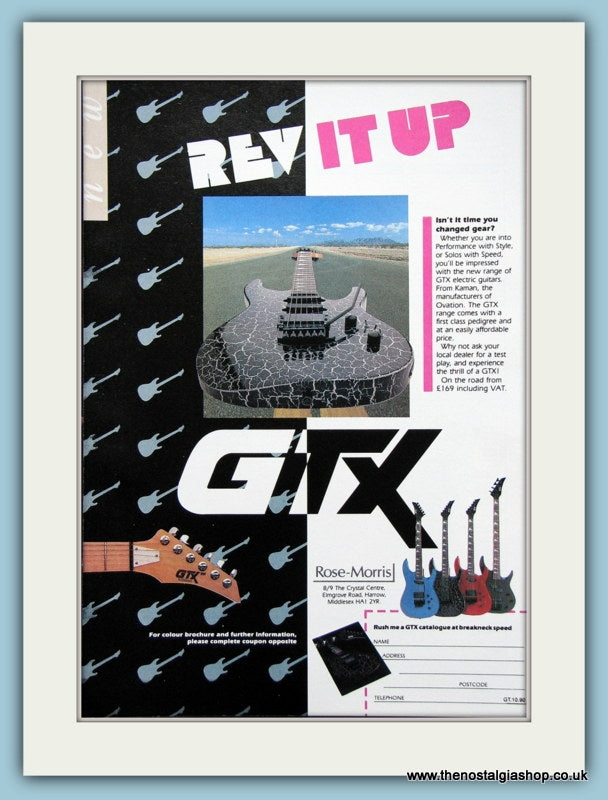 Rev It Up GTX Guitars. Classic original advert 1990. Presented in cream bevel cut mount with backing card. Ready to fit in 14 x 11 inch frame. Want it framing? If so, buy this then go to Frames Available Catagory. Click to buy on the suitable frame and we will do the rest. All our adverts, unless clearly stated are Originals from the date shown. They make excellent pieces of wall art and stunning gifts. Many are rare and hard to find and once sold, may not be replaced. Remember you are buying a piece of history. Website watermark is not on original.