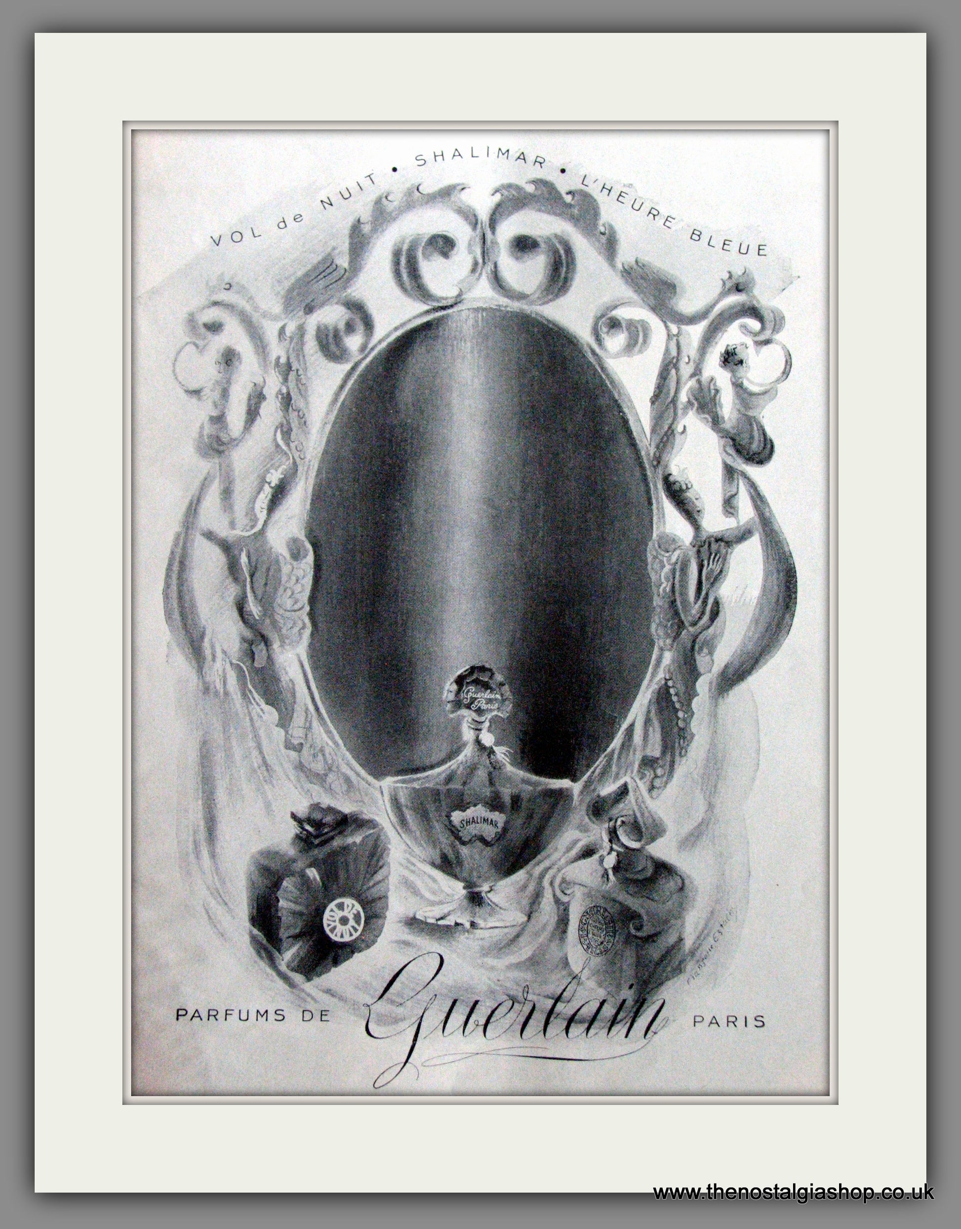 Guerlain. L'Heure Bleue, Vol de Nuit, Shalimar. Perfume. Paris. Classic Original advert from America 1948. Presented in cream bevel cut mount with backing card and clear bag. Ready to fit in 14 x 11 inch frame. Want it framing? If so, buy this then go to Frames Available Category. Click to buy on the suitable frame and we will do the rest. All our adverts, unless clearly stated are Originals from the date shown They make excellent pieces of wall art and stunning gifts. Many are rare and hard to find and once sold, may not be replaced. Remember you are buying a piece of history. Website watermark is not on original.