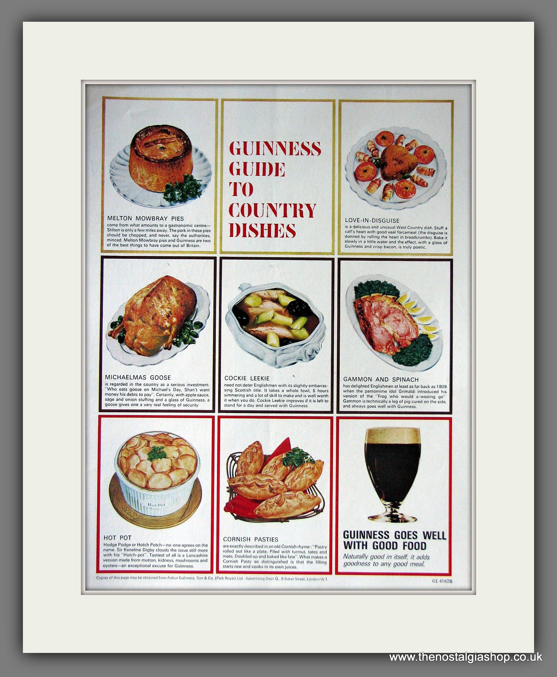 Guinness Guide To Country Dishes. Classic original advert 1966. Presented and Supplied in a cream bevel cut mount with backing card. Ready to fit in 14 x 11 inch frame. Want it framing? buy this then go to Frames Available Category. Click to buy on the suitable frame and we will do the rest. All our adverts, unless clearly stated are Originals from the date shown They make excellent pieces of wall art and stunning gifts. Many are rare and hard to find and once sold, may not be replaced. Remember you are buying a piece of history. Website Watermark is not on Original.
