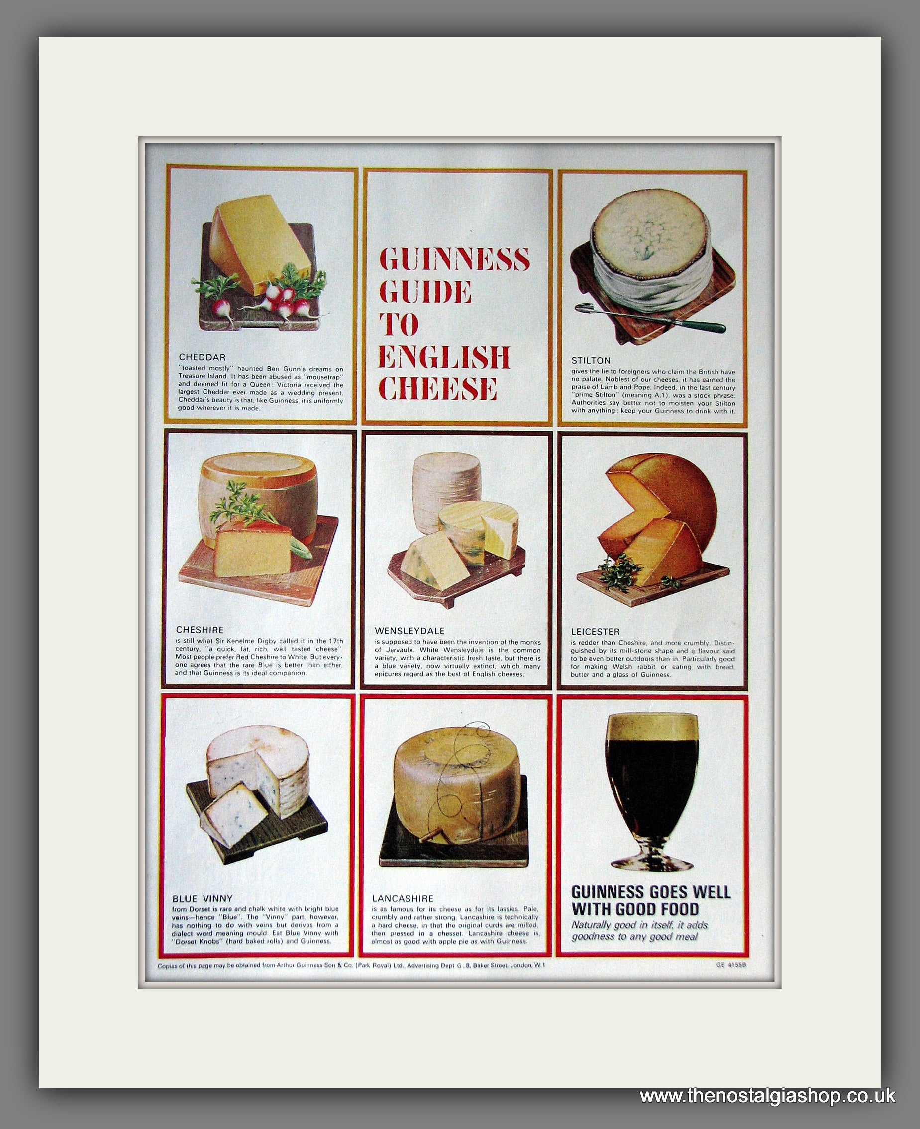 Guinness Guide To English Cheese. Classic original advert 1965. Presented and Supplied in a cream bevel cut mount with backing card. Ready to fit in 14 x 11 inch frame. Want it framing? buy this then go to Frames Available Category. Click to buy on the suitable frame and we will do the rest. All our adverts, unless clearly stated are Originals from the date shown They make excellent pieces of wall art and stunning gifts. Many are rare and hard to find and once sold, may not be replaced. Remember you are buying a piece of history. Website Watermark is not on Original.