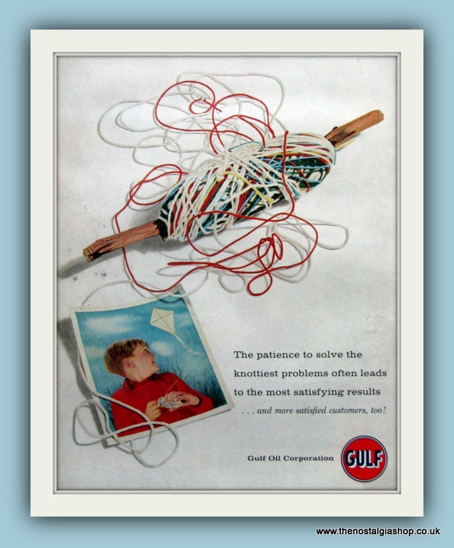 Gulf Oil. The patience to solve the knottiest problems often leads to the most satisfying results. Classic original advert 1958. Presented in a 20 x 16 Inch cream mount with backing board and clear bag. Ready to Frame. All our adverts, unless clearly stated are Originals from the date shown. They make excellent pieces of wall art and stunning gifts. Many are rare and hard to find and once sold, may not be replaced. Remember you are buying a piece of history. Website watermarks are not on original. Adverts will be well packed with hardboard to keep rigid in the post.