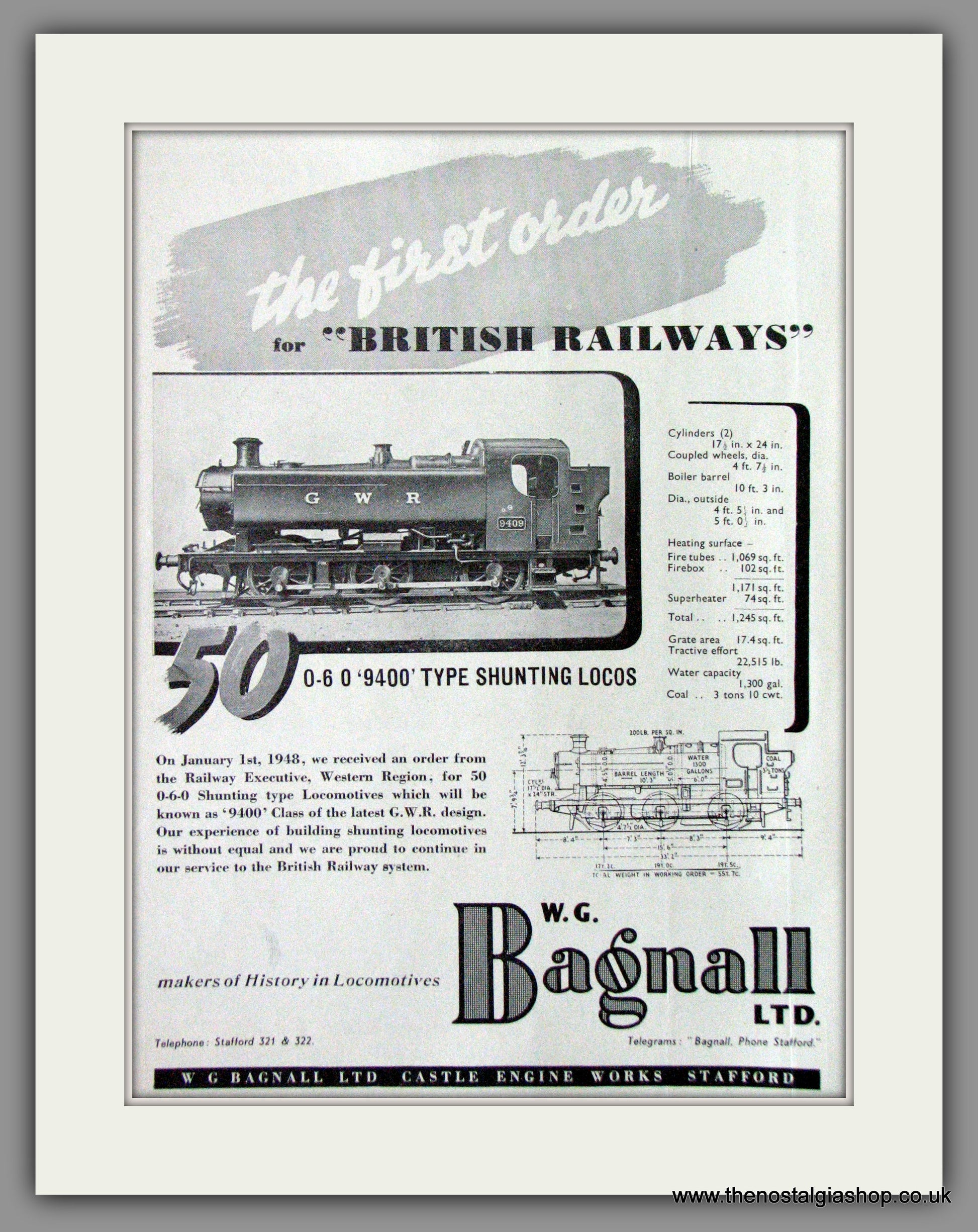 W.G. Bagnall receive first order for British Railways for 50 0-6-0 9400 Type Shunting Locomotives. Classic Original advert 1948. Presented and Supplied in a cream bevel cut mount with backing card and clear bag. Each is ready to fit in 14 x 11 inch frame. Want it framing? If so, buy this then go to Frames Available Category. Click to buy on the suitable frame and we will do the rest. All our adverts, unless clearly stated are Originals from the date shown They make excellent pieces of wall art and stunning gifts. Many are rare and hard to find and once sold, may not be replaced. Remember you are buying a piece of history. Website watermark is not on original.