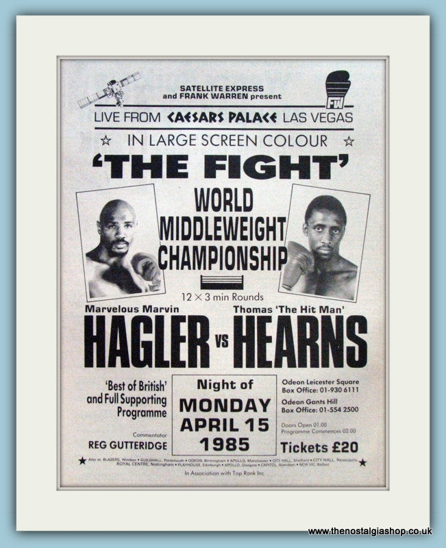 Marvelous Marvin Hagler vs Thomas Hitman Hearns. See the superfight in large screen colour!! Live from Ceasars Palace.Classic original advert 1985. Presented in cream bevel cut mount with backing card and clear bag. Ready to fit in 14 x 11 inch frame. Want it framing? If so, buy this then go to Frames Available Category. Click to buy on the suitable frame and we will do the rest. All our adverts, unless clearly stated are Originals from the date shown They make excellent pieces of wall art and stunning gifts. Many are rare and hard to find and once sold, may not be replaced. Remember you are buying a piece of history. Website watermark is not on original.