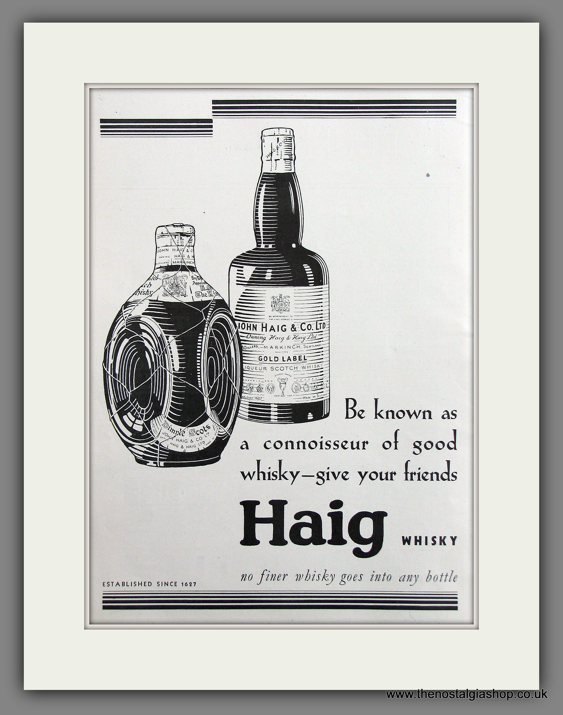 Haig Whisky. Gold Label. Original Vintage Advert 1930. Presented and Supplied in cream bevel cut mount Size 18 x 14 Inches, with backing card and clear bag. Ready to frame. The mounted advert will be posted via courier and well packed - protected with a sheet of hardboard to keep it rigid. Any questions or inquiries, please get in touch, we are here to help! All our adverts, unless clearly stated are Originals from the date shown. They make excellent pieces of wall art and stunning gifts. Many are rare and hard to find and once sold, may not be replaced. Remember you are buying a piece of history. Website watermark is not on original .