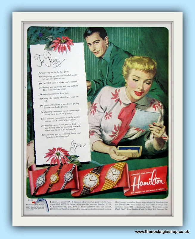 Hamilton Watches. America's fine watch..the watch with railroad accuracy! Classic original advert 1951. Presented in a 20 x 16 Inch cream mount with backing board and clear bag. Ready to Frame. All our adverts, unless clearly stated are Originals from the date shown. They make excellent pieces of wall art and stunning gifts. Many are rare and hard to find and once sold, may not be replaced. Remember you are buying a piece of history. Website watermarks are not on original. Adverts will be well packed with hardboard to keep rigid in the post.