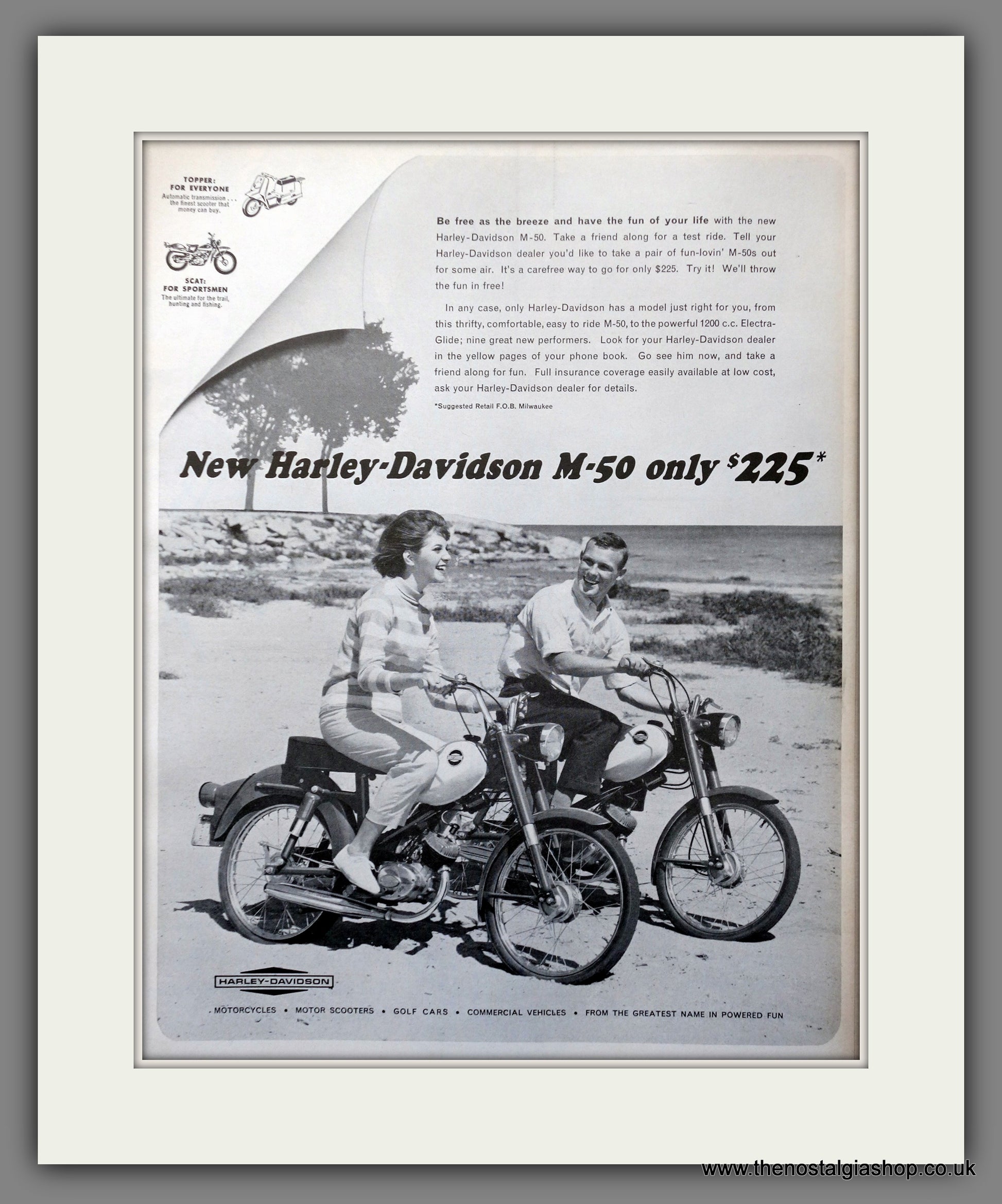 Harley Davidson M 50 Motorcycle. Original Vintage Advert 1964. Presented and Supplied in a 18 x 14 Inch, cream bevel cut mount with backing card and clear bag. Ready to frame. All our adverts, unless clearly stated are Originals from the date shown. They make excellent pieces of wall art and stunning gifts. Many are rare and hard to find and once sold, may not be replaced. Remember you are buying a piece of history. Website watermark is not on original. Harley bikes, Harleys.