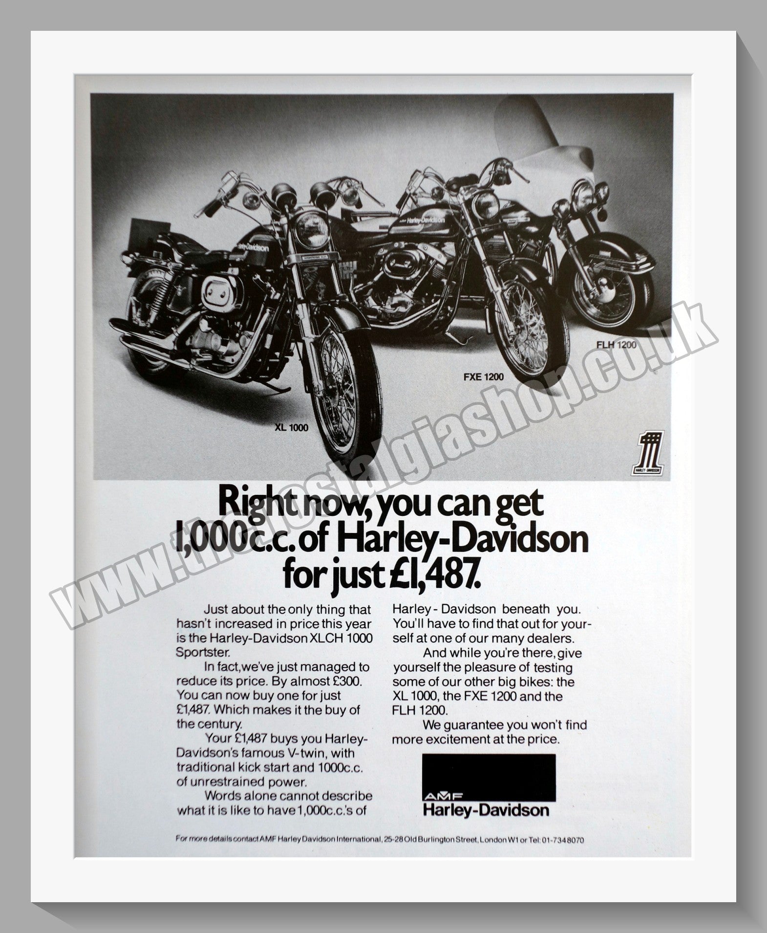 Harley Davidson. XL1000, FXE 1200, FLH 1200 Original advert from 1976. Presented and Supplied in a 14 x 11 Inch, cream bevel cut mount with backing board and clear bag. Ready to frame. The perfect gift. These adverts are all Originals from the dates stated. They are NOT modern reprints. Many are difficult to get hold of , some are very rare and once sold may not be replaced, Remember, you are buying a piece of historic nostalgia. Lots more adverts available. Please contact us if you don't see the advert you want. Website watermark is not on the Advert.
