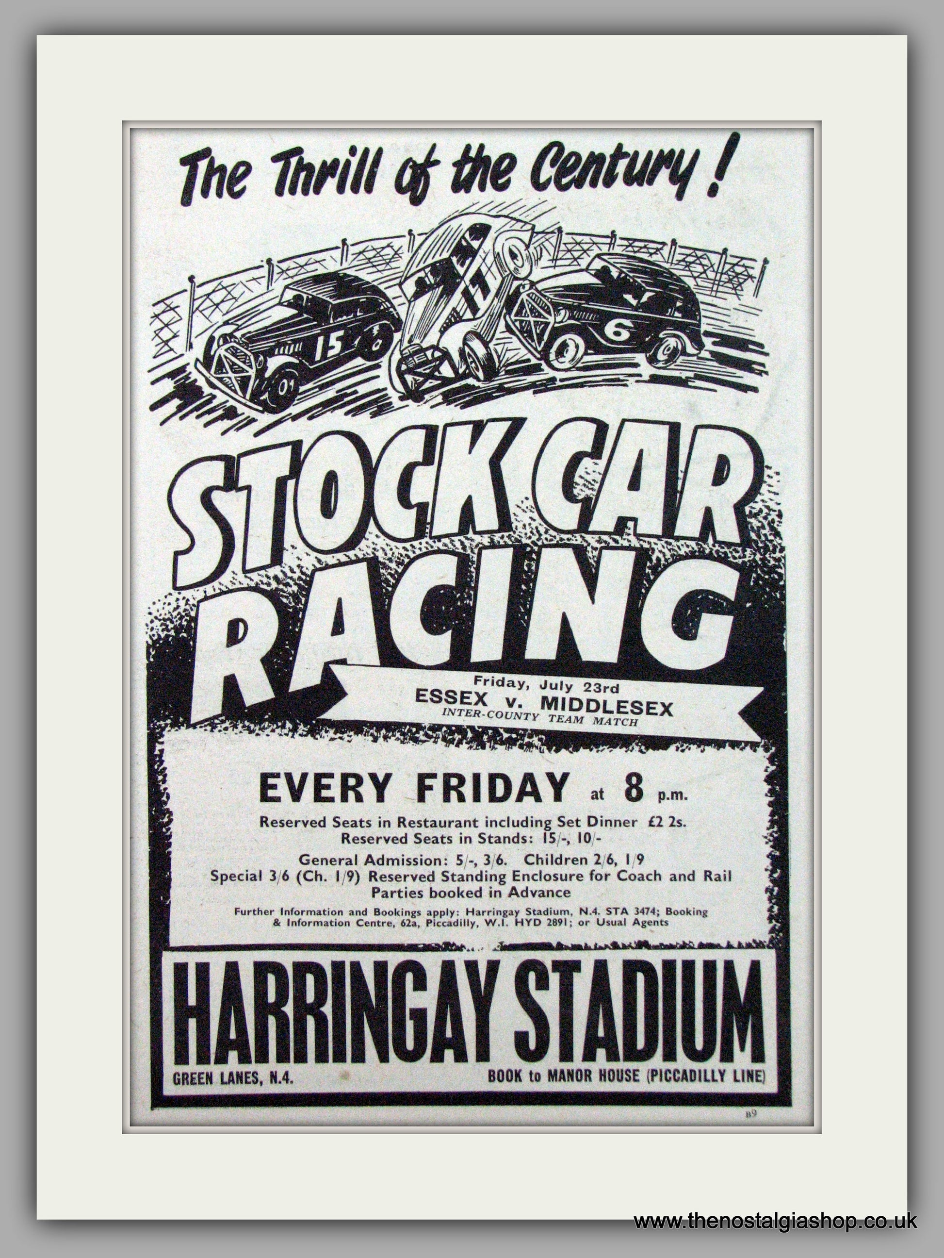 Stock Car Racing at Harringay Stadium. The thrill of the century, every Friday! Essex v Middlesex. Classic original advert 1954. Presented in cream bevel cut mount with backing card and clear display bag. Ready to fit in 14 x 11 inch frame. Want it framing? If so, buy this then go to Frames Available Category. Click to buy on the suitable frame and we will do the rest. All our adverts, unless clearly stated are Originals from the date shown. They make excellent pieces of wall art and stunning gifts. Many are rare and hard to find and once sold, may not be replaced. Remember you are buying a piece of history. Website watermark is not on original.