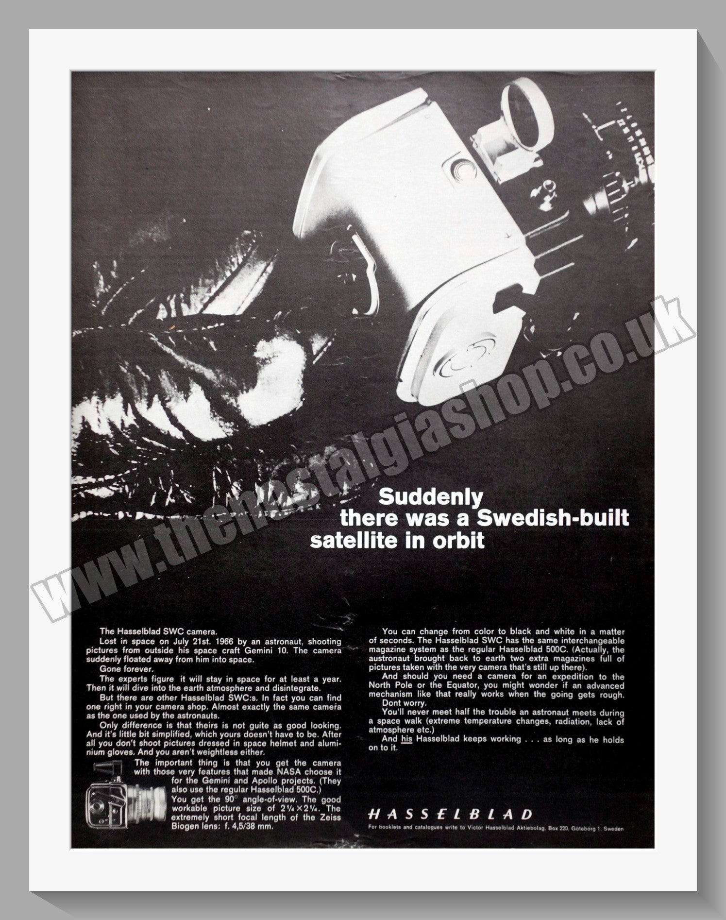 Hasselblad 500C SLR Camera. Vintage Advert. Classic Original Advert 1967. Presented and Supplied in a cream bevel cut mount with backing card and clear bag. Ready to fit in 20 x 16 inch frame. Will be well packed with a sheet of hardboard to keep the mounted Advert flat. All our adverts, unless clearly stated are Originals from the date shown. They make excellent pieces of wall art and stunning gifts. Many are rare and hard to find and once sold, may not be replaced. Remember you are buying a piece of history. Website watermark is not on original. Vintage Cameras, Old Cameras.