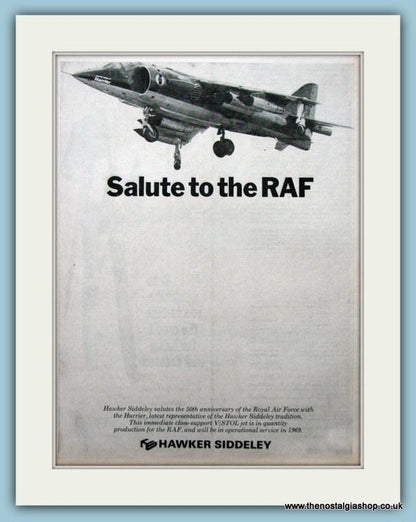 Hawker Siddeley. Hawker Siddeley makes Harrier jets that go straight up in the air... Classic original adverts 1968 (price is for both adverts). Presented in cream bevel cut mount with backing card and clear bag. Each is ready to fit in 14 x 11 inch frames. Want them framing? If so, buy this then go to Frames Available Category. Click to buy on the suitable frame and we will do the rest. All our adverts, unless clearly stated are Originals from the date shown They make excellent pieces of wall art and stunning gifts. Many are rare and hard to find and once sold, may not be replaced. Remember you are buying a piece of history. Website watermark is not on original.