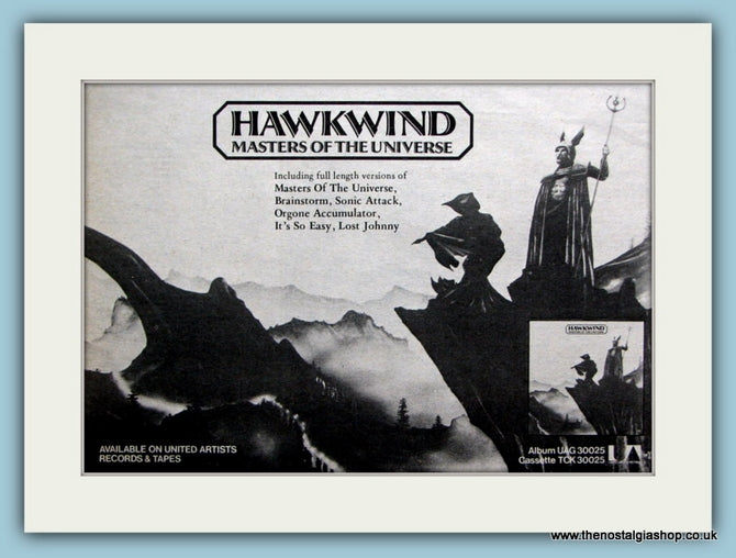 Hawkwind. Masters of the Universe, new album. Classic original advert 1977. Professionally sealed and presented in cream bevel cut mount with backing card. Ready to fit in 14 x 11 inch frame. Want it framing? If so, buy this then go to Frames Available Catagory. Click to buy on the suitable frame and we will do the rest. All our adverts, unless clearly stated are Originals from the date shown. They make excellent pieces of wall art and stunning gifts. Many are rare and hard to find and once sold, may not be replaced. Remember you are buying a piece of history. Website watermark is not on original.